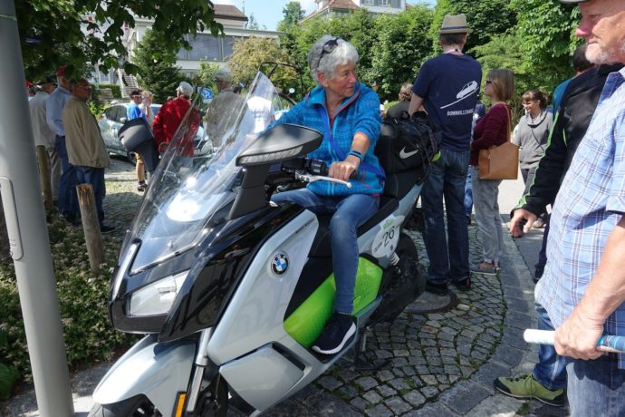 Im Gegensatz dazu muss man bei diesem BMW C Evolution (max. Geschwindigkeit 130 km/h, Reichweite 200 km, 17’000 Fr.) zweimal hingucken, um ihn von einem richtigen Töff unterscheiden zu können. Gegen Ende trafen auch noch zwei E-Bike-Fahrer ein.