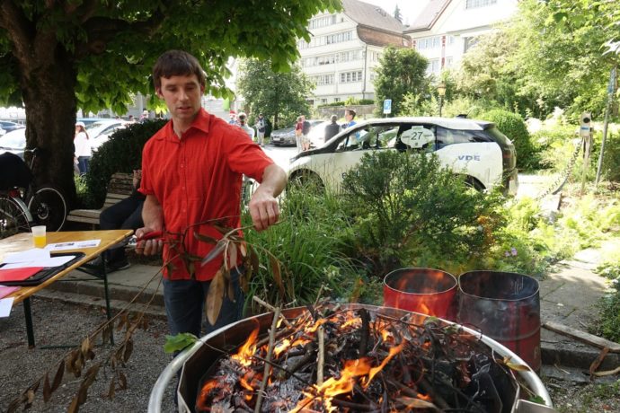 Nachhaltig ist auch die Anwendung von Kon-Tiki: Überschüssiges Holz oder trockener Strauchschnitt werden durch das sogenannte Pyrolyseverfahren nicht einfach verbrannt, sondern zu Pflanzenkohle veredelt, die dem Kompost beigemischt wird und die Umwandlungsprozesse zu Humus verbessert. Der Hersteller Markus Koller aus Gais demonstrierte die Geräte, die auch als Grill benutzt werden können.