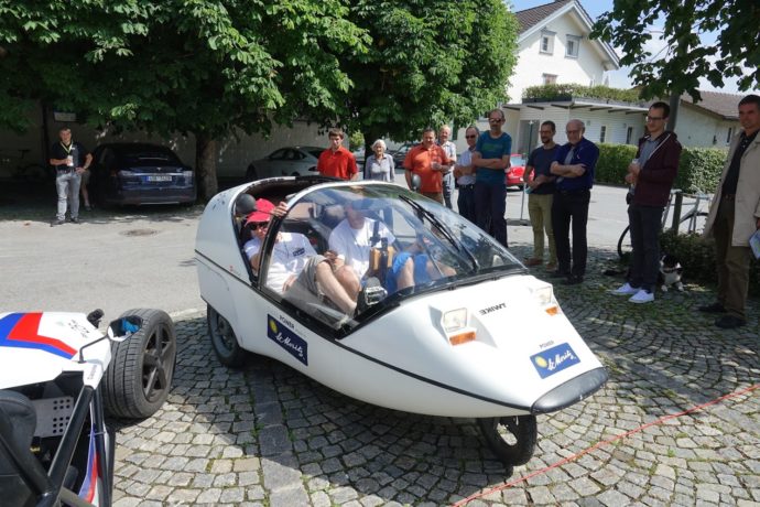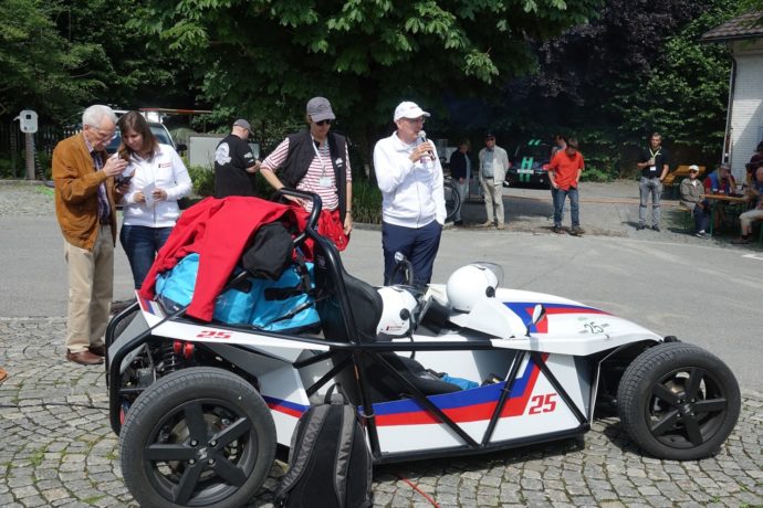 Dazwischen immer wieder mal ein Exot, wie beispielsweise das Go-Kart ähnliche Fahrzeug der Schweizer Firma Kyburz, bestens bekannt durch die gelben Briefträger-Untersätze, das nur als Bausatz (Kostenpunkt 35’000 Franken, max. Geschwindigkeit 130 km/h, Reichweite 120 km) erhältlich ist und selber zusammengebaut werden muss.