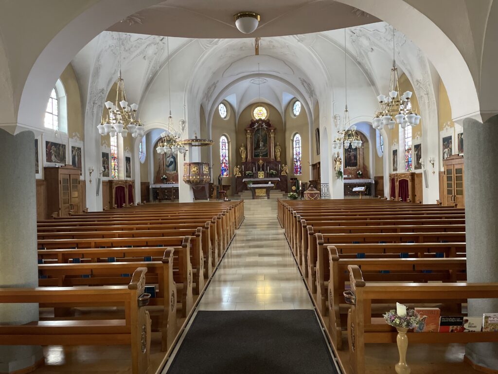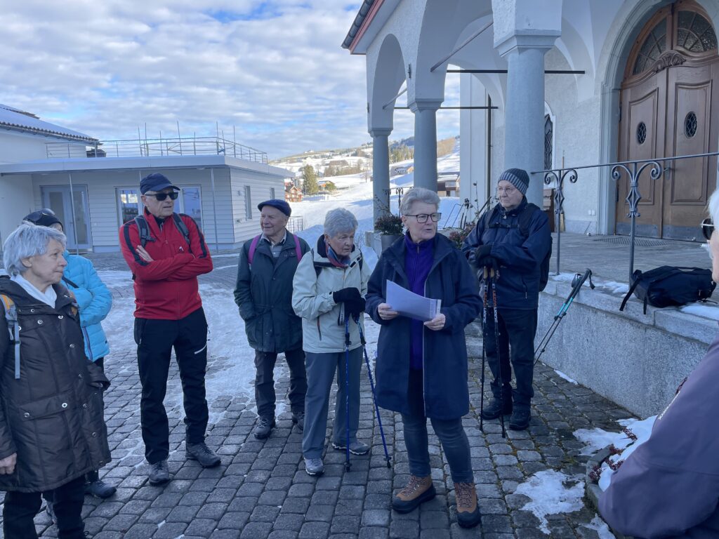 Die Kirchentüre steht offen und so schauen viele Teilnehmende kurz hinein und bewundern die schöne und auffallend grosse Kirche in diesem kleinen Dorf. Wanderleiterin Rosy Rechsteiner erzählt ein paar Informationen zur Örtlichkeit.
