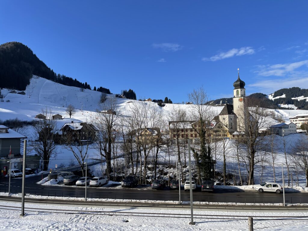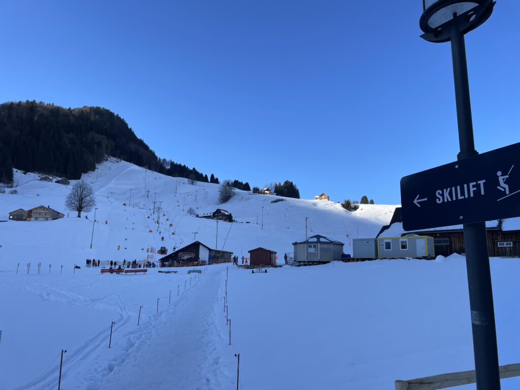 In Weissbad geht’s weiter bis zum Restaurant Loosmühle und dort rechts hinauf Richtung Lehmenstrasse. Kurz darauf links weg via Strubejockelis und Böschelbüeblis zum Dörfchen Schwende. Vor der imposanten Kirche macht die Gruppe halt. Der Skilift Horn vis à vis ist in Betrieb. Vor allem Schulklassen fahren den schattigen Hang hinunter und scheinen grossen Gefallen daran zu finden.