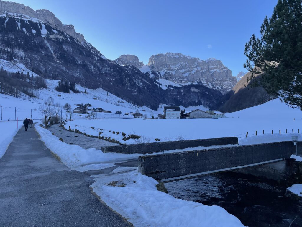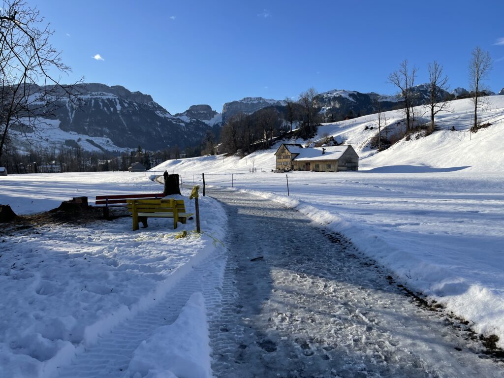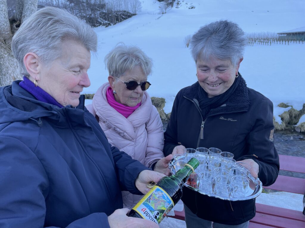 Ab Schwende war die Wanderung über die Wiesen, bzw. Schneefelder, via Fridisjockes und Unterbild geplant. Dafür ist es heute zu stark vereist, was wenig verwundert. Denn ab hier wandert die Gruppe im Schatten der hohen Berge. Heute auf dem Radweg der dem Schwendebach entlang führt. Die gefühlte Temperatur bei leichtem Wind liegt mindestens zehn Grad tiefer und ist bis in die Knochen spürbar. Da kommt die Idee der Wanderleitung gerade richtig. Bei einer Sitzbank werden ein Tablar, Becherlein und eine Flasche Appenzeller Alpenbitter ausgepackt. Alle stossen auf ein gutes (Wander)Jahr an. Herzerwärmend.