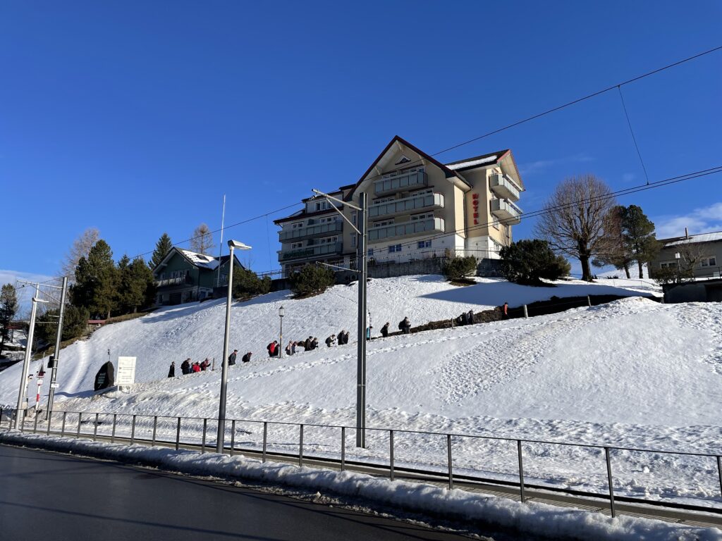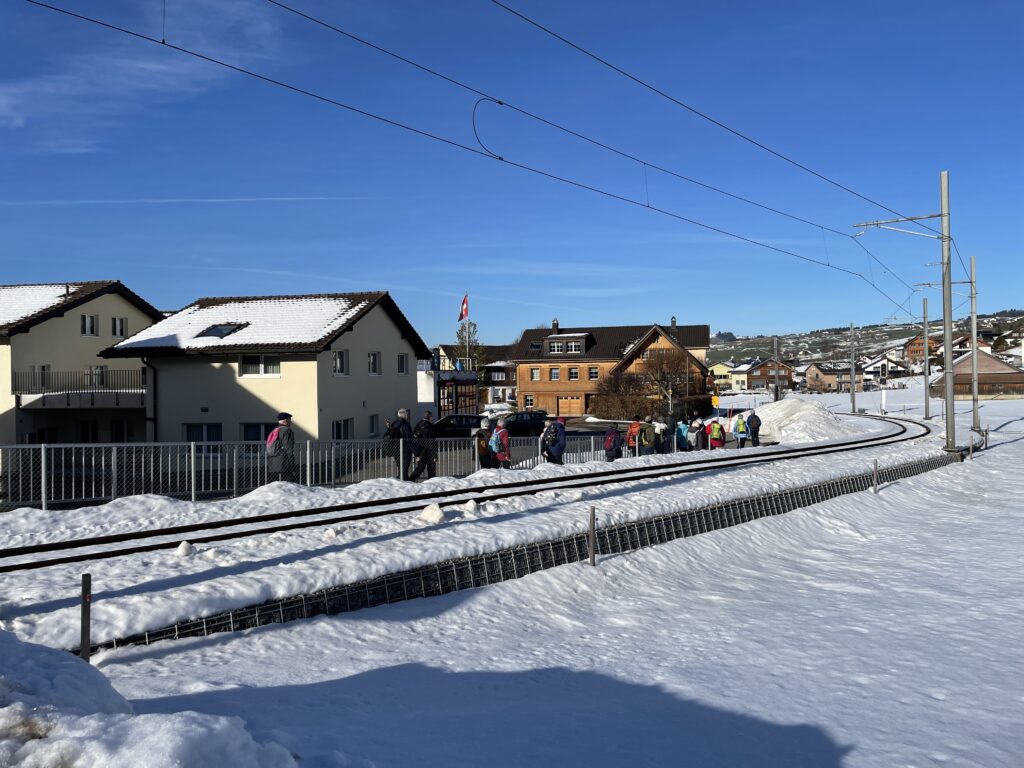 28 Mitglieder der Wandergruppe Tüüfe treffen sich zur ersten Wanderung 2026 am Bahnhof Steinegg AI. Heute ist der 15. Januar. Im Jahresprogramm war diese Wanderung eine Woche früher geplant. Die Wetterprognosen damals sahen für Wasserauen gefühlte Temperaturen von minus 12 Grad und aufkommende Bewölkung vor. Heute hingegen scheint die Sonne schon auf der Anfahrt nach Steinegg und ermöglicht einen herrlichen Blick in den (noch) schneebedeckten Alpstein. Ein Föhnlage lässt die Temperaturen um rund 20 Grad ansteigen und den frisch gefallenen Pulverschnee vor den Augen dahinschmelzen. Leider, denn im Januar hätten ich viele gerne länger behalten.