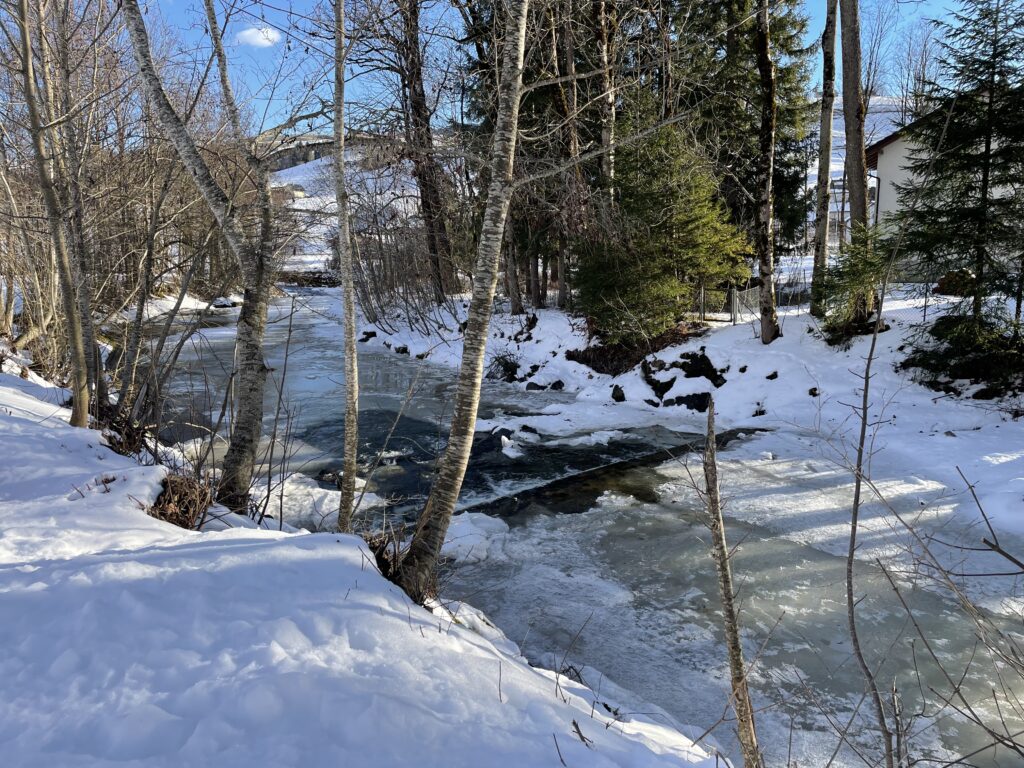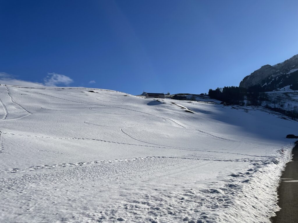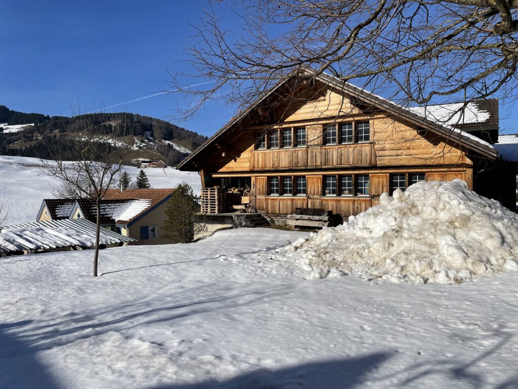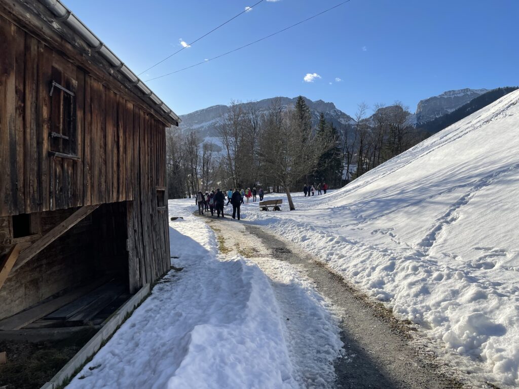 Der Rückweg nach Steinegg führt durch die leicht erhöhte Siedlung Zidler nach Weissbad und am neuen Fabrikationsgebäude der Biberli Bischofberger vorbei. In Steinegg nehmen die meisten den Zug zurück nach Hause. Einzelne wandern der Sitter entlang bis nach Appenzell und geniessen die wärmende Nachmittagssonne an diesem wunderschönen Wintertag.