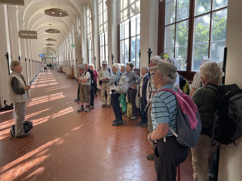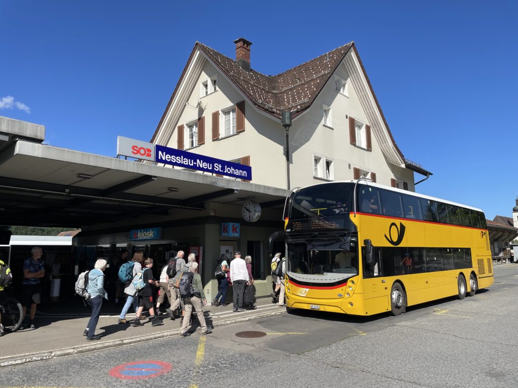 Weil das ursprünglich geplante Postauto ab Wattwil keine Gruppen transportiert, nimmt die Gruppe eine spätere Zugverbindung bis Nesslau und erst von dort den gut gefüllten Doppelstockbus Richtung Wildhaus für die letzten Kilometer nach Stein SG. Bereits im Bogengang des Bahnhofs St. Gallen erteilt das Wanderleiter-Team deshalb erste Informationen zum Ausgangspunkt der Wanderung.