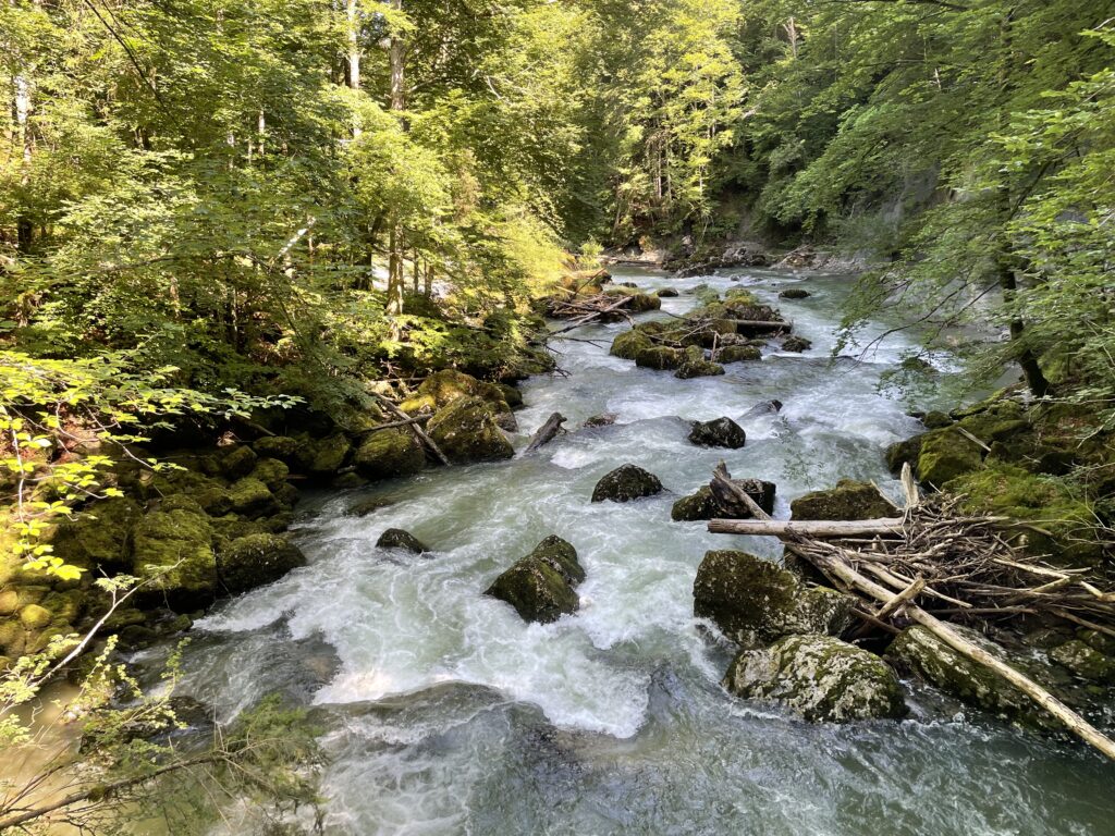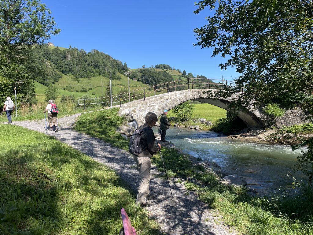 Nichts davon ist glücklicherweise heute an der reichlich wasserführenden Thur zu spüren. Die Gruppe wandert talwärts am Giessenfall vorbei und wechselt dabei mehrmals die Uferseite. Stellenweise geht es über Steine, Wurzeln, Treppen auf und ab durch herrliche Landschaften mit immer wieder wechselnden Passagen der noch wenig gezähmten Thur.