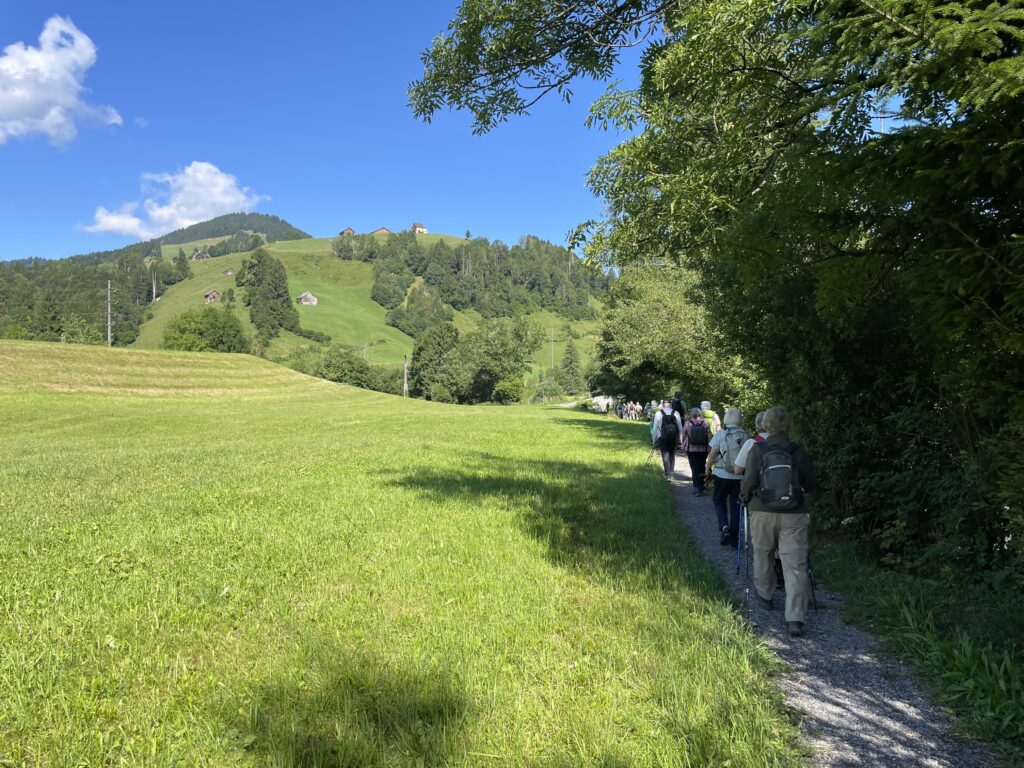 Bis vor Kurzem hat es noch stark geregnet und oben auf dem Säntis gar geschneit. Doch heute, am Wander-Donnerstag vom 10. Juli, könnte das Wetter nicht passender sein. 23 Mitglieder der Wandergruppe Tüüfe sind mit Marie-Theres und Hans-Werner Butz Richtung Toggenburg unterwegs.