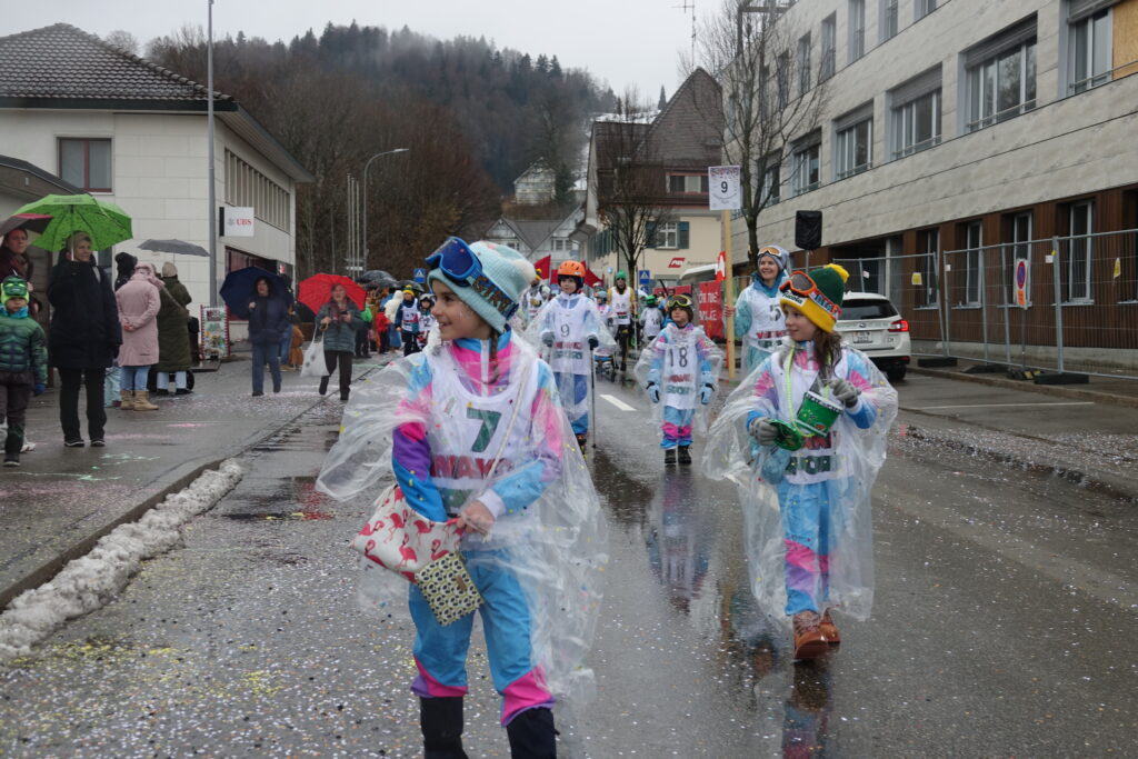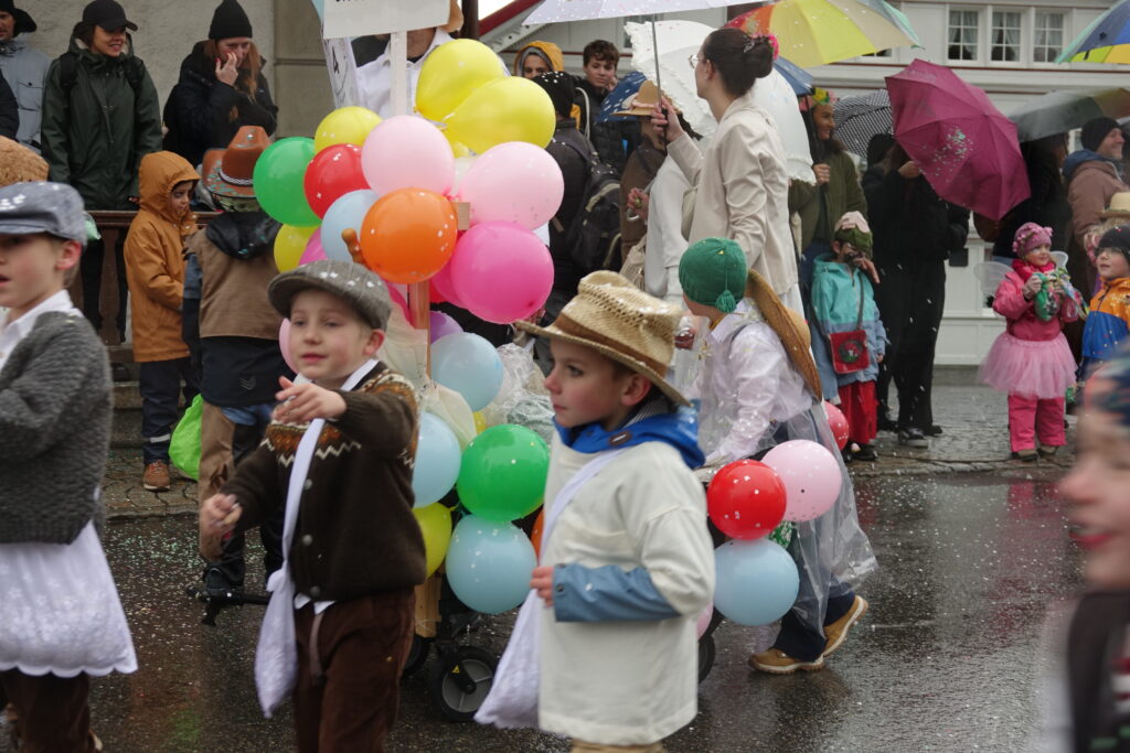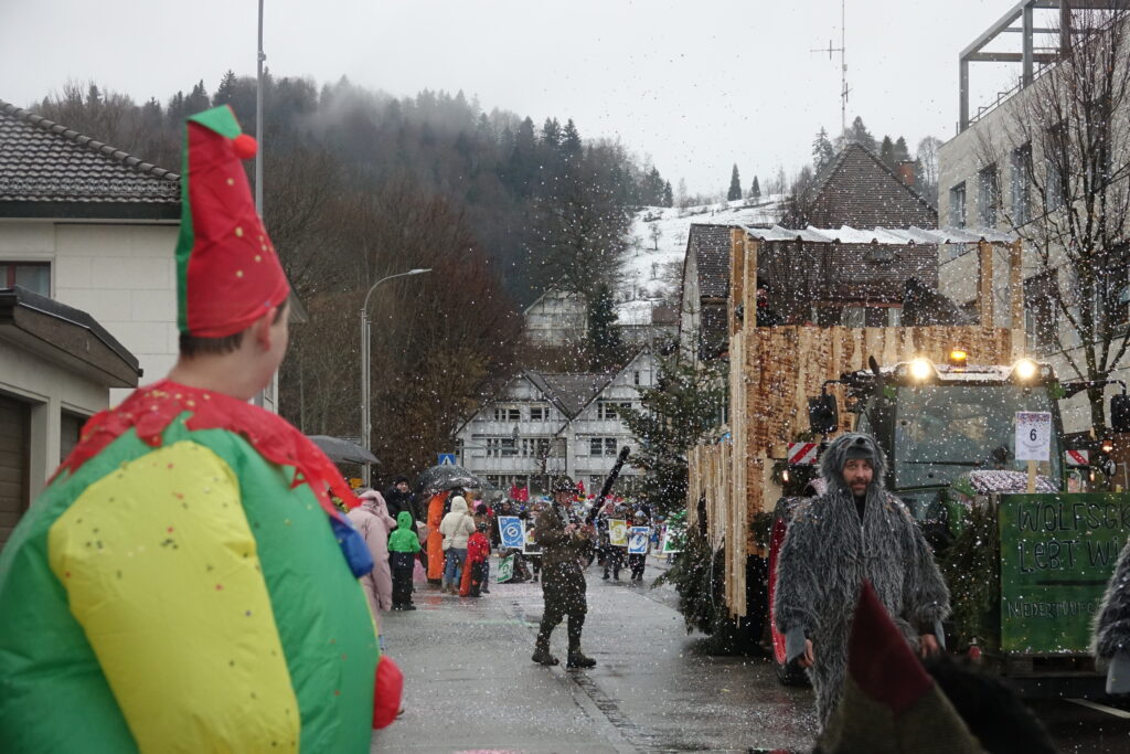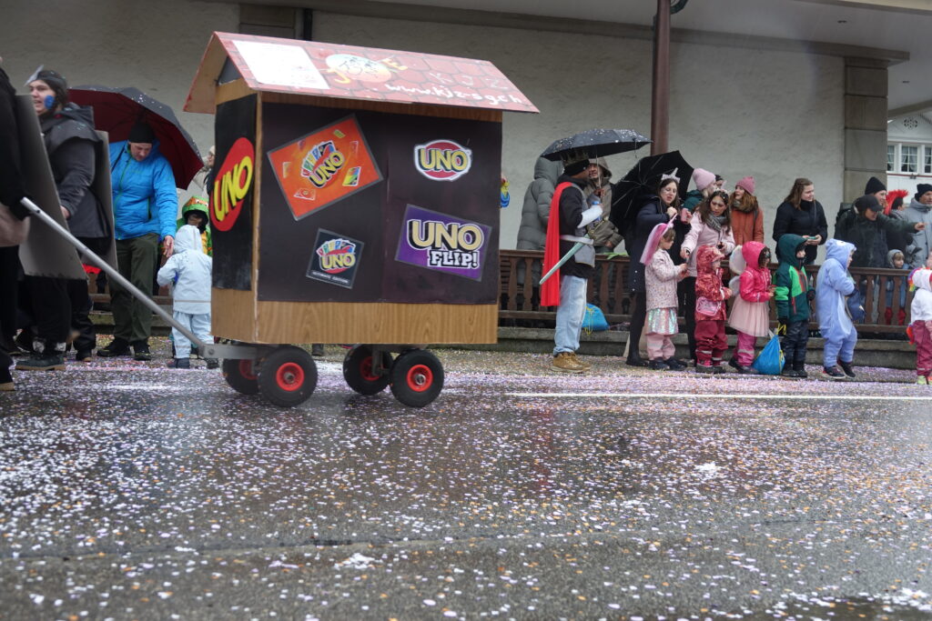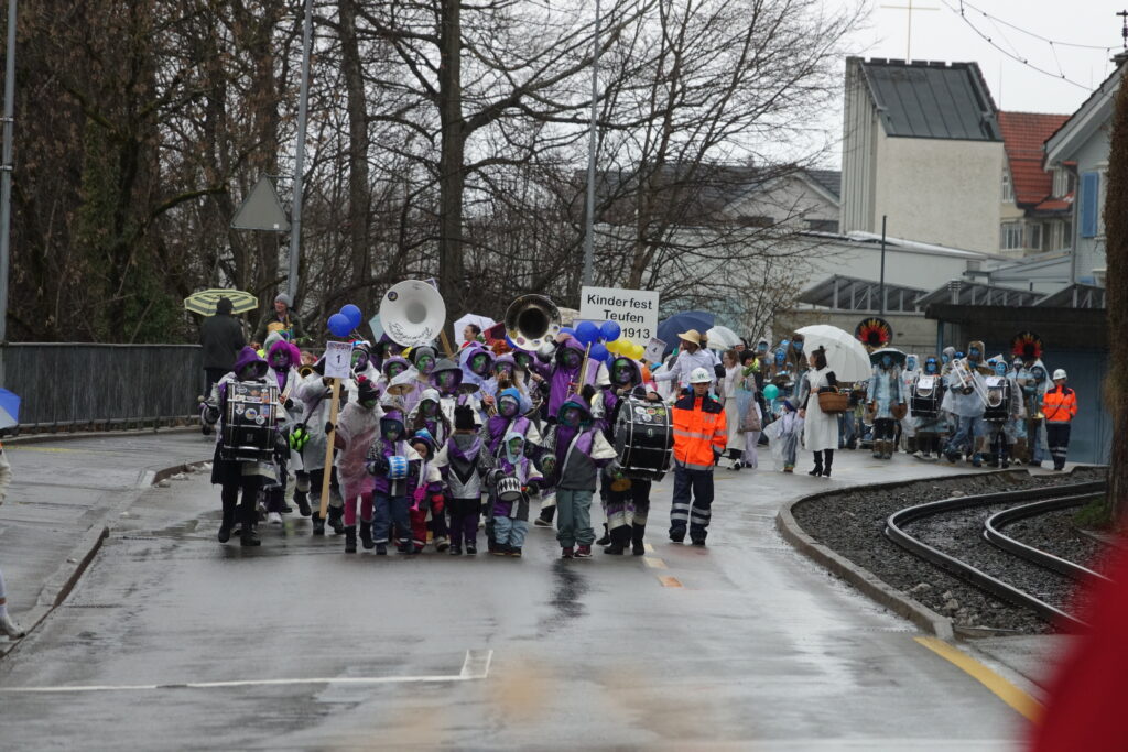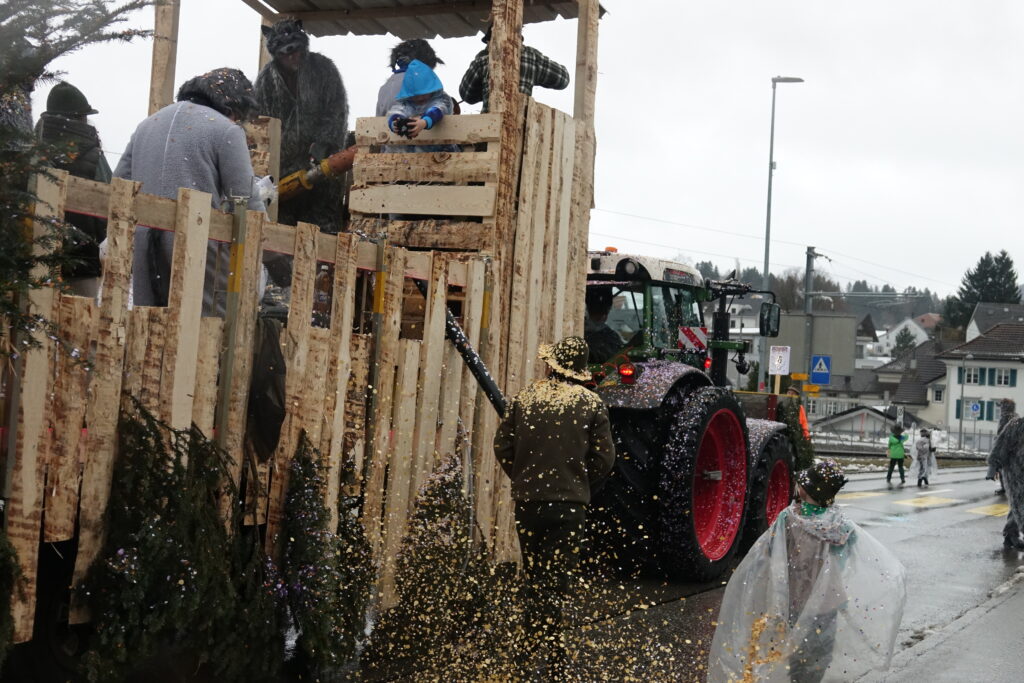 Angeführt wurde der Umzug von der Guggenmusik Tüüfner Südwörscht. Entlang der Strecke regnete es Konfetti, zudem wurden Süssigkeiten an die Zuschauenden verteilt. Kleine und grosse Wagen waren zu sehen, alle aufwändig gestaltet und mit schönen, spannenden Details versehen, teilweise auch mit Konfettikanonen ausgerüstet.
