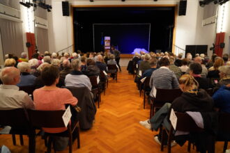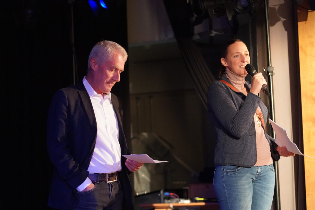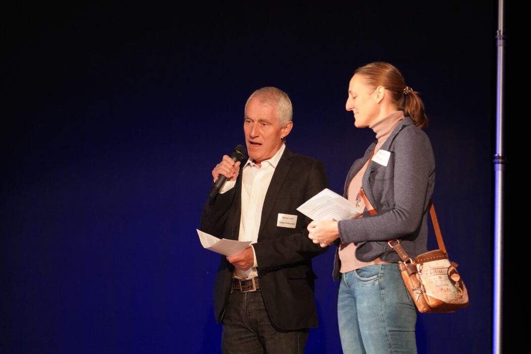 Nach Aufführungen in Wolfhalden und Herisau begrüssen Sabrina Steiger, Geschäftsleiterin Pro Senectute Appenzell Ausserrhoden und Roman John, Geschäftsführer Spitex Rotbachtal, das Publikum im sehr gute besetzten Lindensaal an diesem Samstag, 11. November, um 14 Uhr.