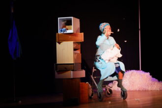 Frau Schneebeli (Vreni Achermann) sitzt wartend auf ihrem Rollator in ihrer Wohnung. Sie zupft Schneeflocken aus ihrem Federkissen und «schneit» vor sich hin. Die Atmosphäre wirkt stumpf, kühl und traurig.