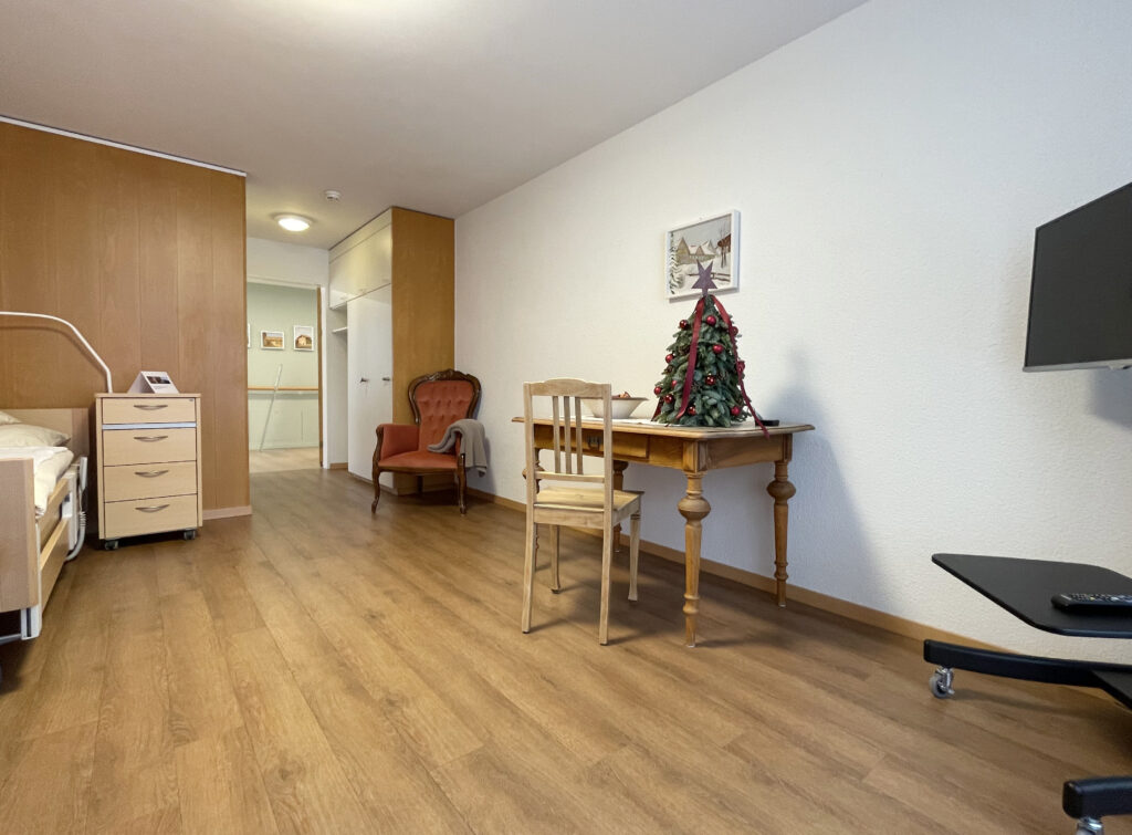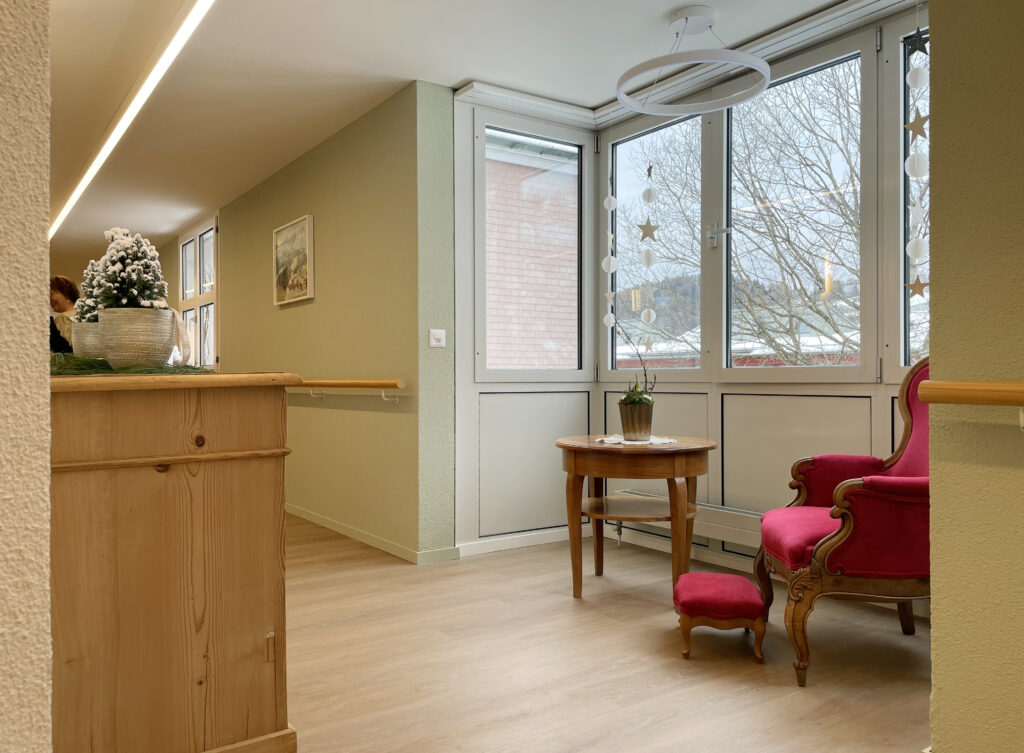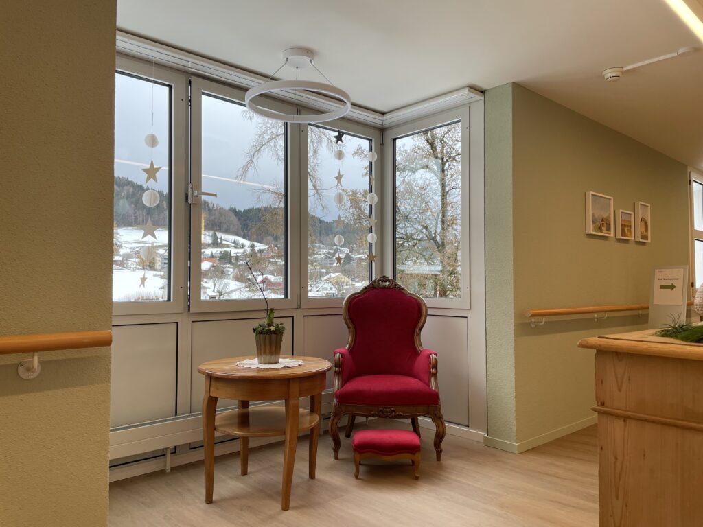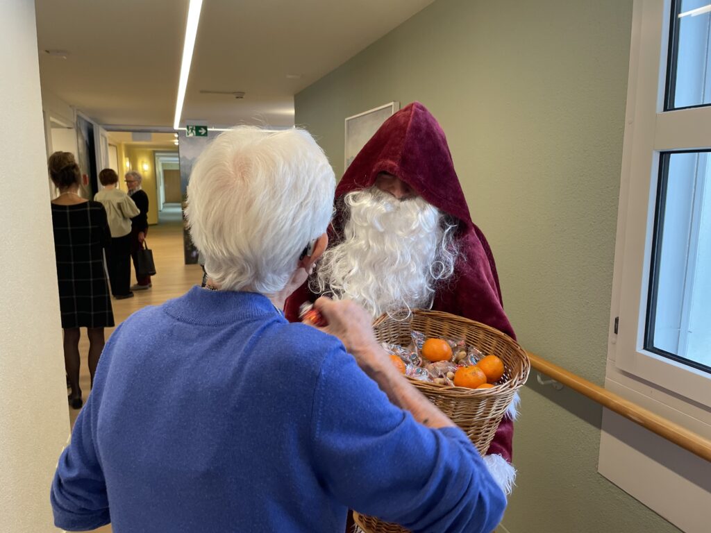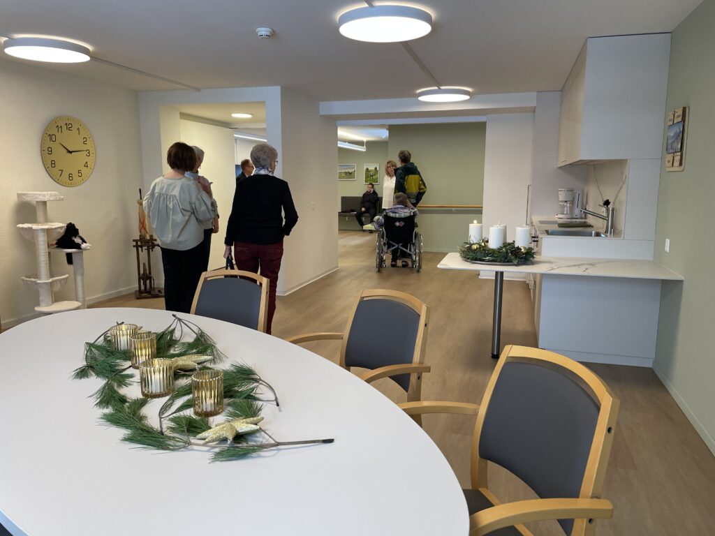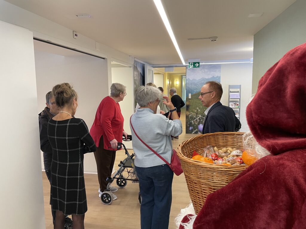 Den Besuchenden steht ein «Musterzimmer» offen. Es wirkt ebenfalls heimelig, hell und freundlich. Auf dem geräumigen Gang ist heute sogar der Samichlaus unterwegs. Er ist extra noch einmal gekommen, um den zahlreichen Besucherinnen und Besuchern Mandarinen, Nüsse oder Süsses anzubieten, sofern sie in der Vergangenheit «brav» waren, wie er betont. Im Eingangsbereich im Erdgeschoss wird man an einem reichhaltigen Buffet verwöhnt. Und draussen brennt eine Feuerschale im Schnee. Auch das ist von der neuen Demenzabteilung aus gut beobachtbar. Das Ganze ist eine wohl durchdachte Dosierung von kleinen Anreizen und Stimuli und gleichzeitig genügend Ruhe und Raum. Genauso, wie es Menschen zu mögen scheinen, die schrittweise in ihre eigene Welt entgleiten.