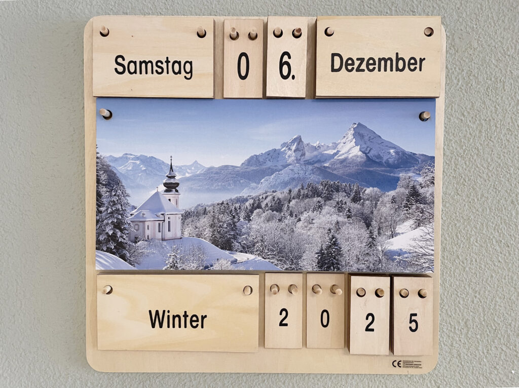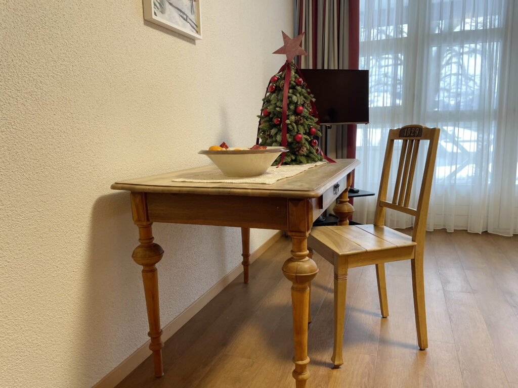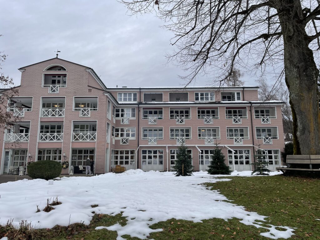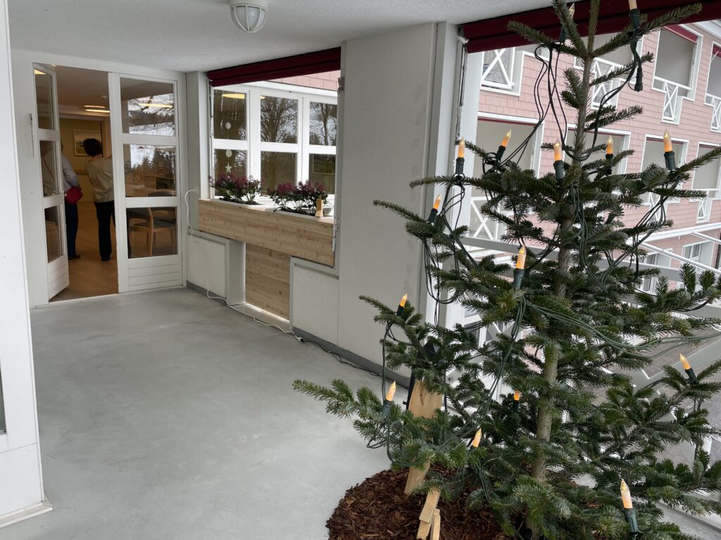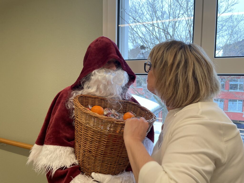 Den Besuchenden steht ein «Musterzimmer» offen. Es wirkt ebenfalls heimelig, hell und freundlich. Auf dem geräumigen Gang ist heute sogar der Samichlaus unterwegs. Er ist extra noch einmal gekommen, um den zahlreichen Besucherinnen und Besuchern Mandarinen, Nüsse oder Süsses anzubieten, sofern sie in der Vergangenheit «brav» waren, wie er betont. Im Eingangsbereich im Erdgeschoss wird man an einem reichhaltigen Buffet verwöhnt. Und draussen brennt eine Feuerschale im Schnee. Auch das ist von der neuen Demenzabteilung aus gut beobachtbar. Das Ganze ist eine wohl durchdachte Dosierung von kleinen Anreizen und Stimuli und gleichzeitig genügend Ruhe und Raum. Genauso, wie es Menschen zu mögen scheinen, die schrittweise in ihre eigene Welt entgleiten.
