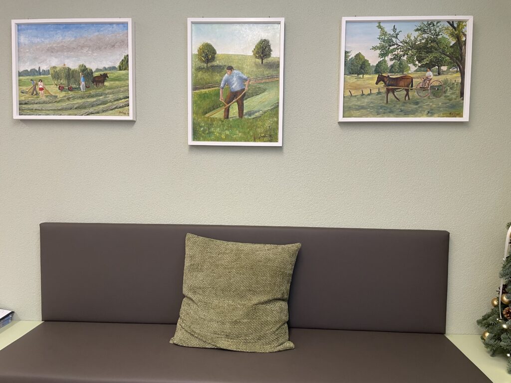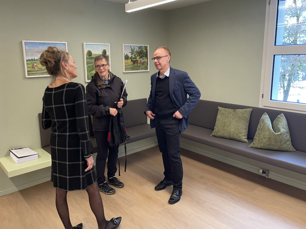 Urs Frei, zuständiger Gemeinderat, Helga Fässler, Teamleitung Pflege und Hans Graf, Leiter Technik und Sicherheit, haben Ursina Moser während der ganzen Planung und Umsetzung des Projektes tatkräftig unterstützt. So stehen sie auch heute, beim offiziellen Durchschneiden des Bandes, in der Türe zur neuen Abteilung. Nach dem Eintreten befindet man sich in einem Aufenthaltsraum mit grosszügiger Eckbank. Bilder aus früheren Zeiten mit Sujets aus der Landwirtschaft hängen an der Wand.