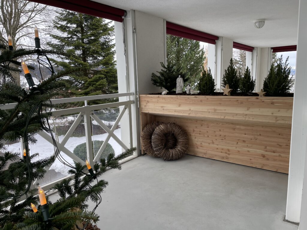 Von der Abteilung aus ist ein grosszügiger Balkon auf die Südseite hin zugänglich. Und hier draussen riecht es erfrischend nach Arvenholz. Als Abtrennungen zur übrigen Balkonfläche und als Geländerteil dienen Hochbeete aus dem wohlriechenden und beruhigenden Bergholz. Der Kontakt und die Kommunikation zu anderen Mitbewohnenden können «frei über das Hochbeet hinaus» sattfinden und die Aussicht ist herrlich hier.