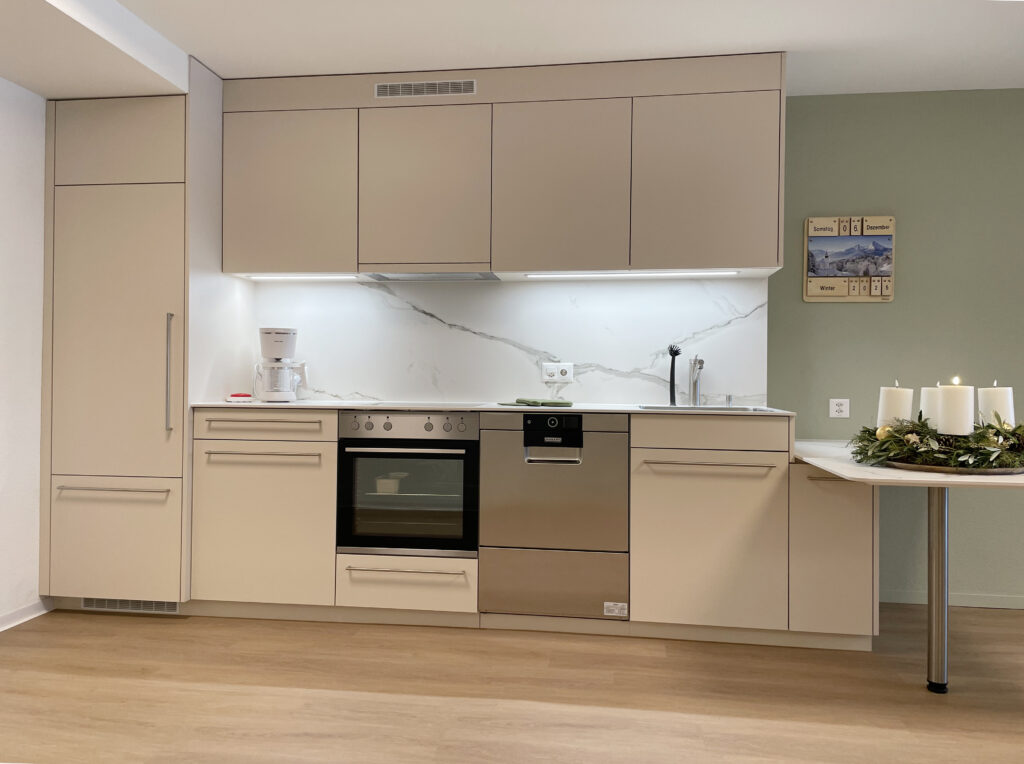 Der Esszimmer-Küchenbereich wirkt freundlich und grosszügig. «Die Holzstühle sind bereits 37 Jahre lang im Lindenhügel im Einsatz. Wir haben sie einfach neu beziehen lassen und so passen sie doch wunderbar zum Ganzen und sie sind immer noch sehr stabil und bequem», freut sich Ursina Moser.
