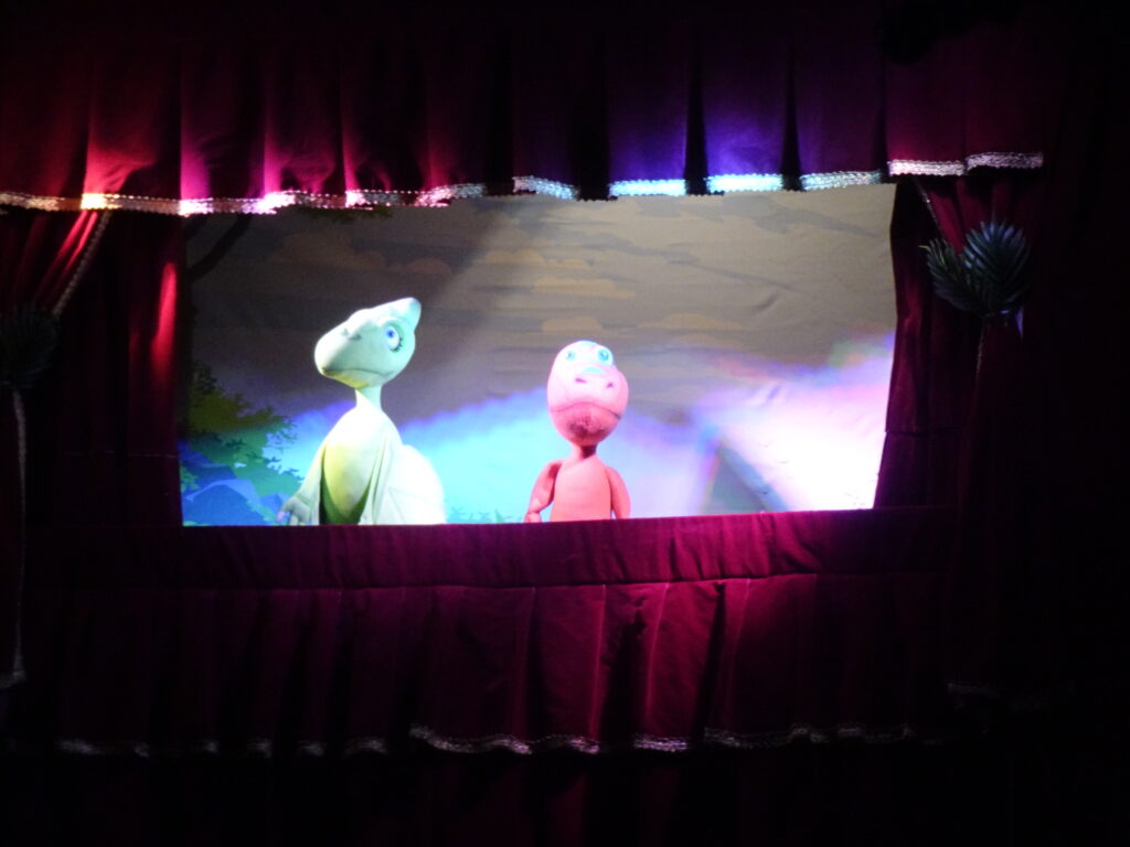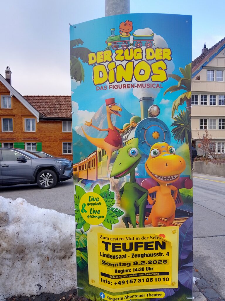 Gespielt wurde mit grossen Stabfiguren und immer wieder sangen und tanzten die Figuren und die Zuschauenden klatschten mit. Ein Musical, kindgerecht dargestellt. Nach der Aufführung durften die Kinder sich beim Ausgang von Dino Buddy und dem Schaffner persönlich verabschieden, den Beiden die Hand geben und auf Wiedersehen sagen. Wer weiss, vielleicht kommen die Dinos wieder nach Teufen für weitere Erlebnisse.