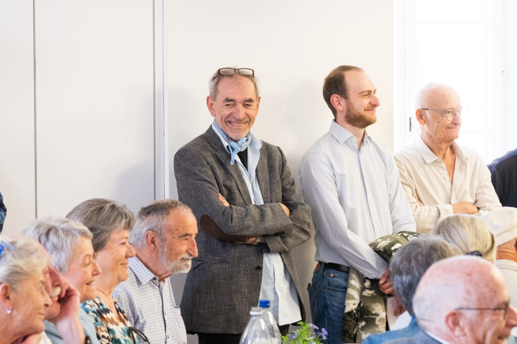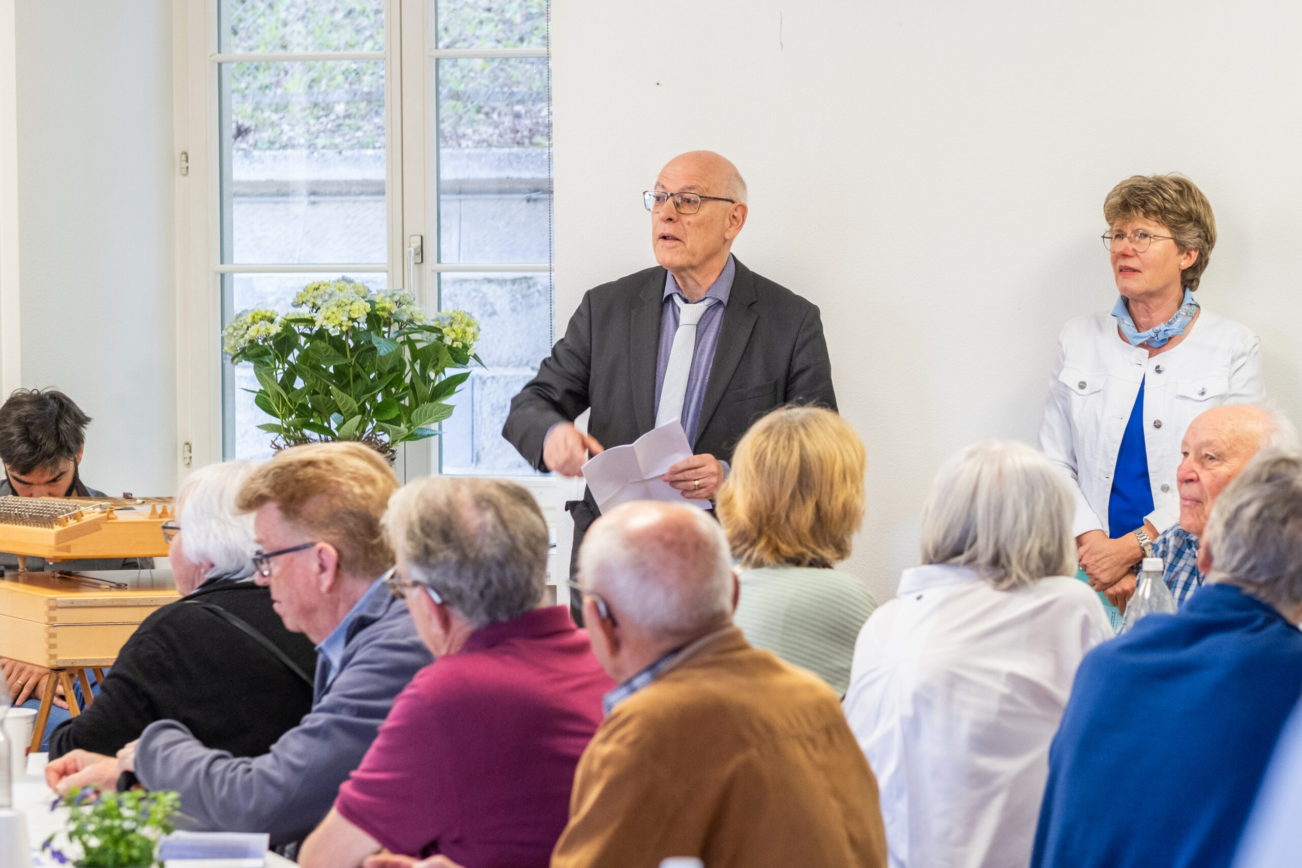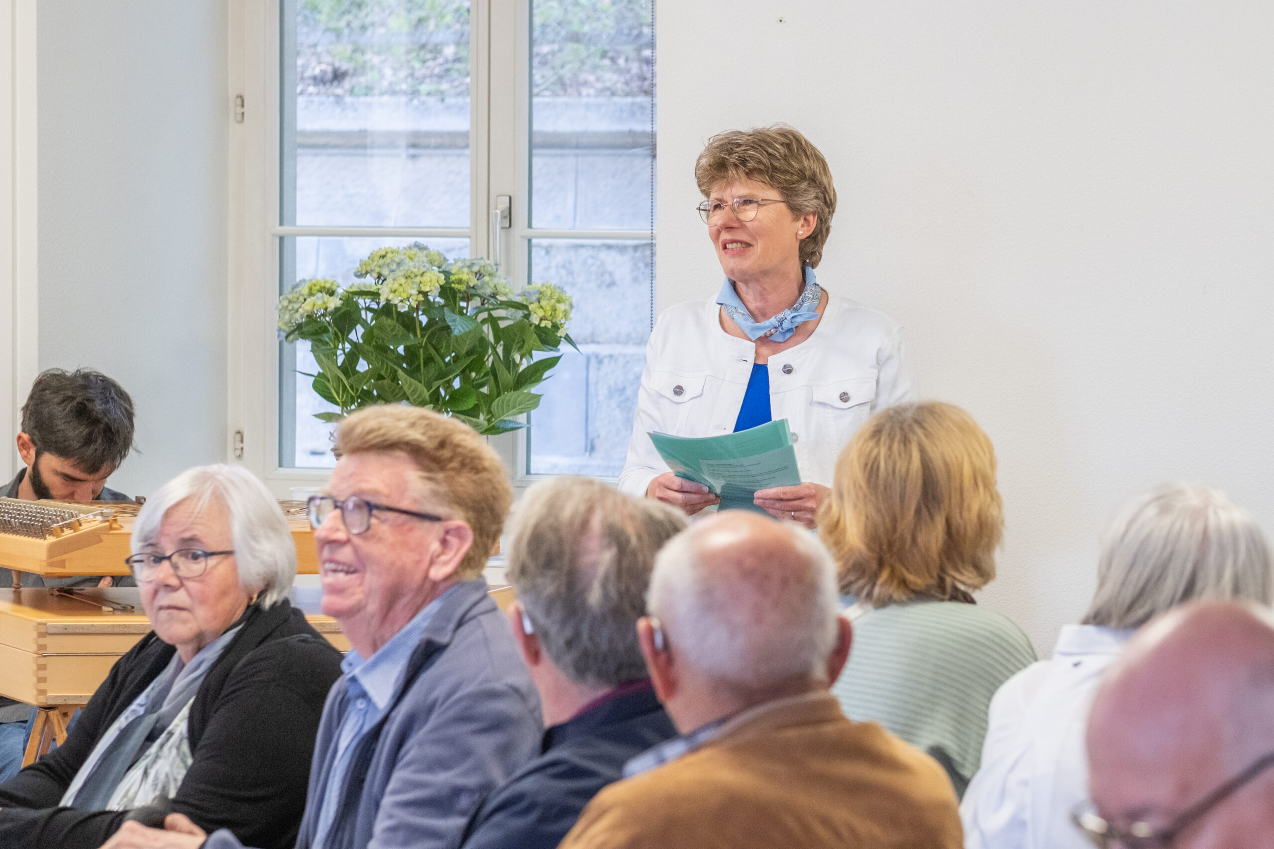 Der Platz im grossen Schulzimmer im Erdgeschoss wurde knapp, als Vereinspräsidentin Ursula von Burg um 11:30 Uhr die Gäste begrüsste. «Es freut mich unheimlich, dass so viele Menschen gekommen sind. Und dass darunter so viele bekannte Gesichter sind – inklusive einiger Gründungsmitglieder.» Diese Gründung war im Spätherbst 1995. Im Dezember wurde die 0-Nummer in Teufen verteilt – damals noch namenlos. Dieses Problem sollte mit einer Umfrage gelöst werden. «Es gingen über 600 Vorschläge ein. Eine unglaubliche Resonanz», sagte Andreas Heller. Er ist eines ebendieser Gründungsmitglieder und erzählte von den Anfängen der inzwischen gut etablierten Dorfzeitung. «So eine Zeitung zu entwickeln, ist natürlich eine sehr spannende Angelegenheit. Da geht es ums Layout, das Papier, die Schrift, die Rubriken, und, und, und.» Er erinnert sich auch heute noch gern an das befriedigende Gefühl, als er und seine Mitstreiterinnen und Mitstreiter realisierten, dass ihr neu geschaffenes Produkt auch wirklich ankommt. «Die Zeitung hat sich zudem während der vergangenen 30 Jahre stets weiterentwickelt, der Umfang hat sich vergrössert und die Qualität ist sehr hoch», sagt der ehemalige NZZ-Journalist.