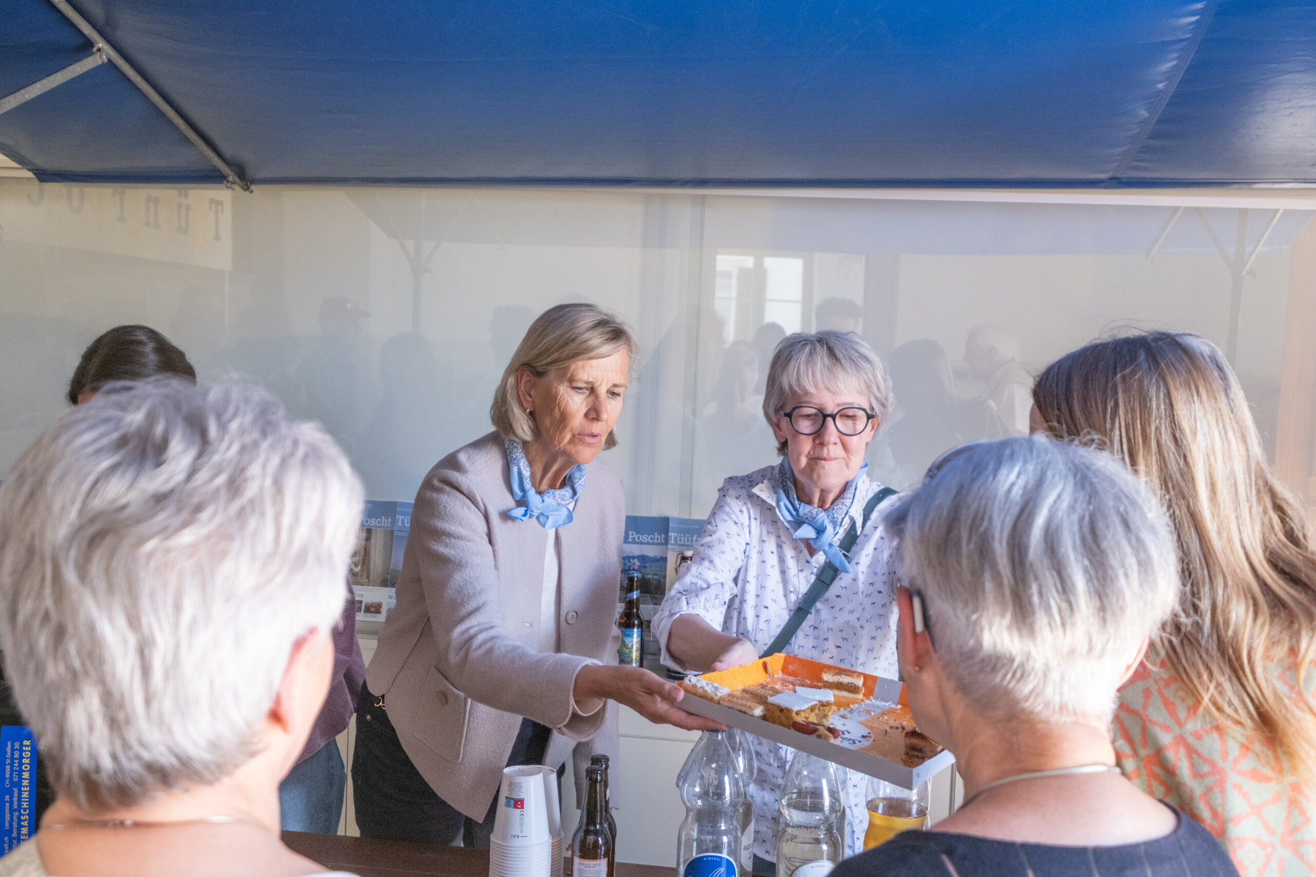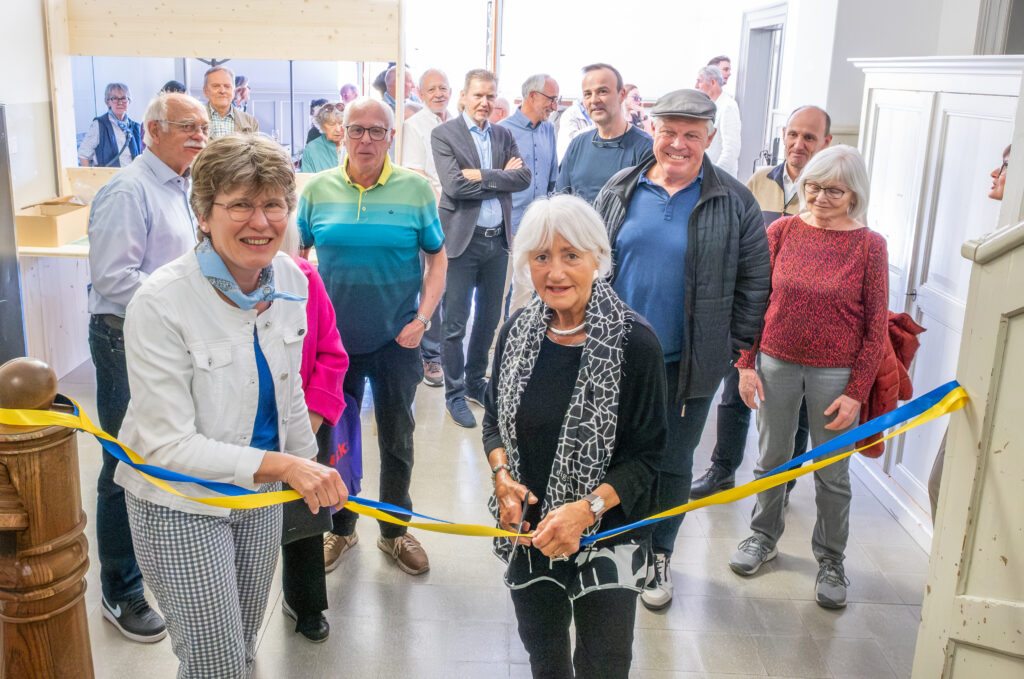 Die Ausstellung ist eröffnet! Das Band durchschneidet Gründungsmitglied Gaby Bucher. Ohne ihre Überzeugungsarbeit im Gemeinderat, wäre die Tüüfner Poscht vielleicht nie gegründet worden.