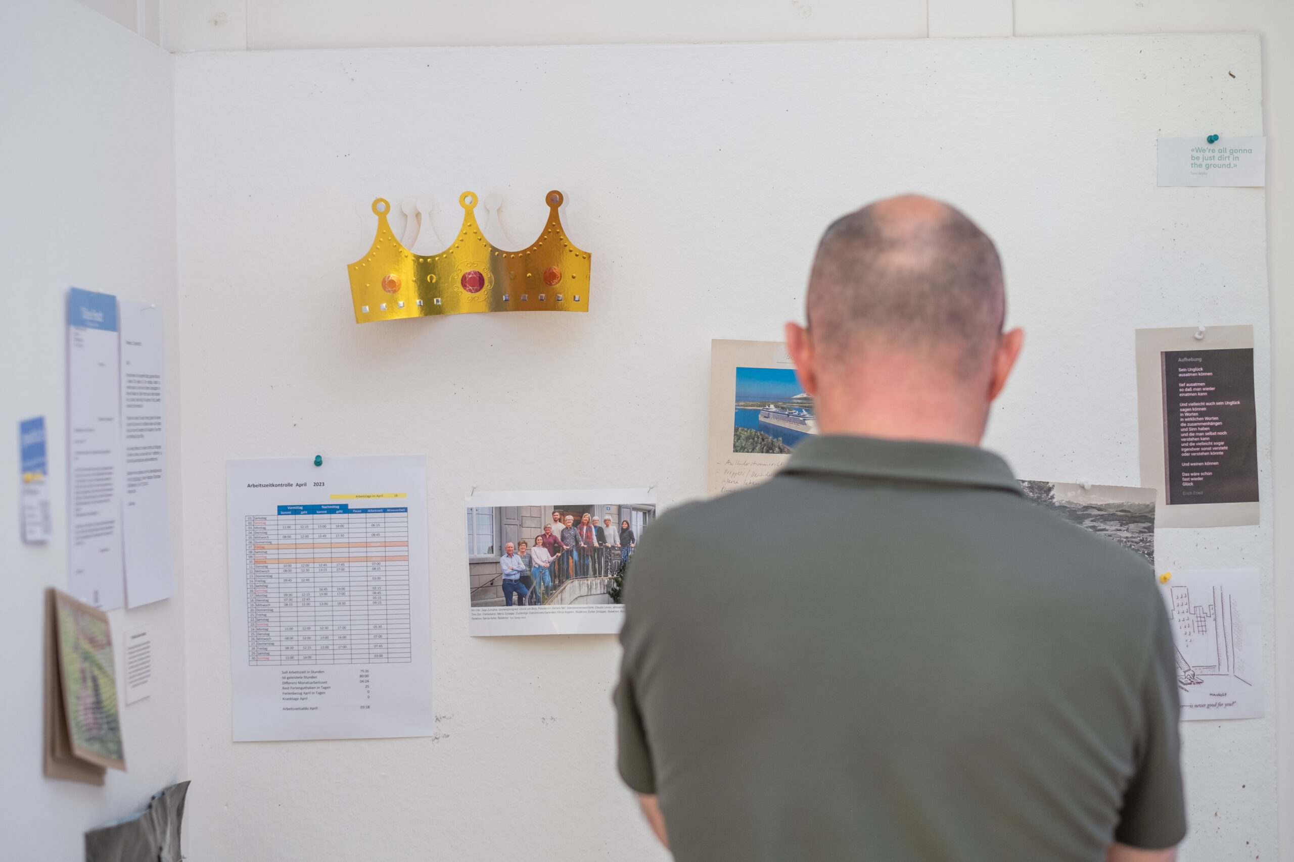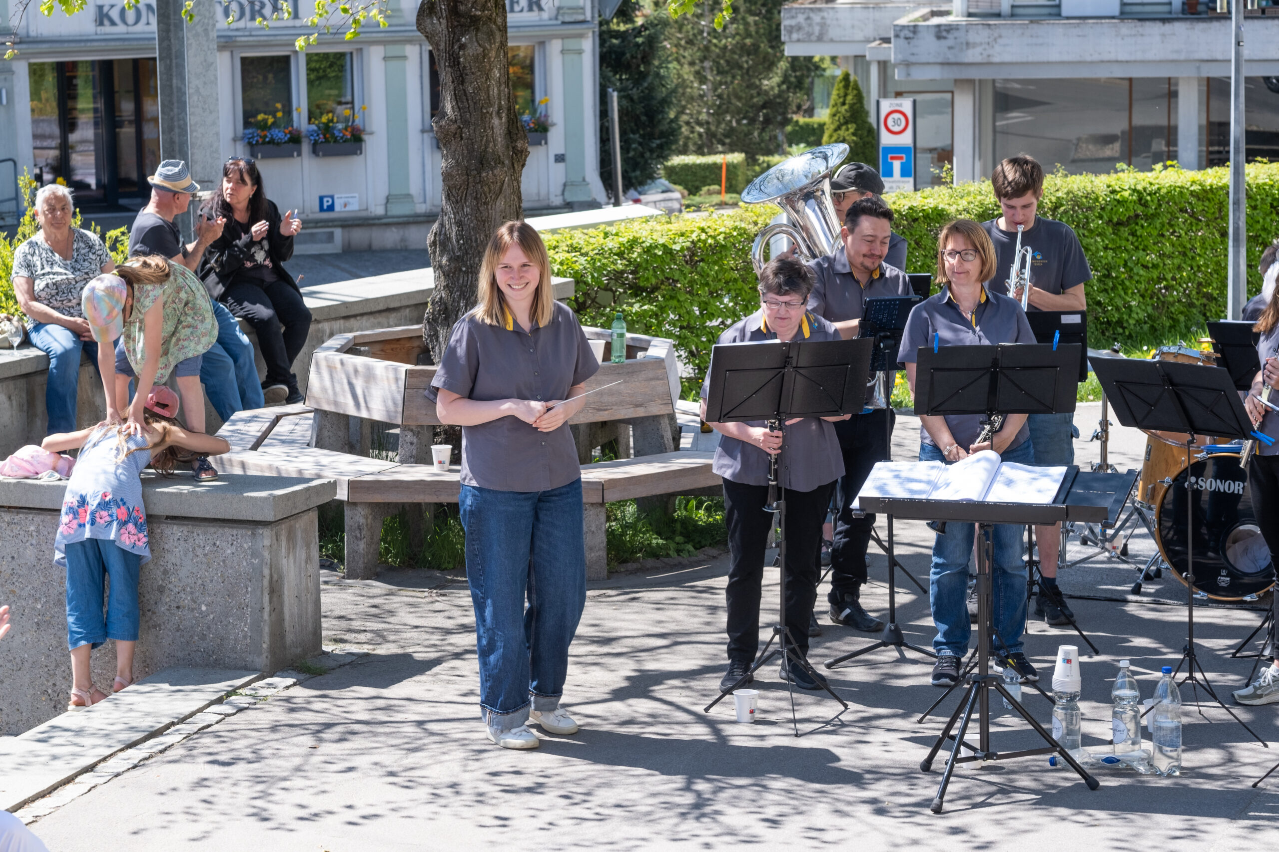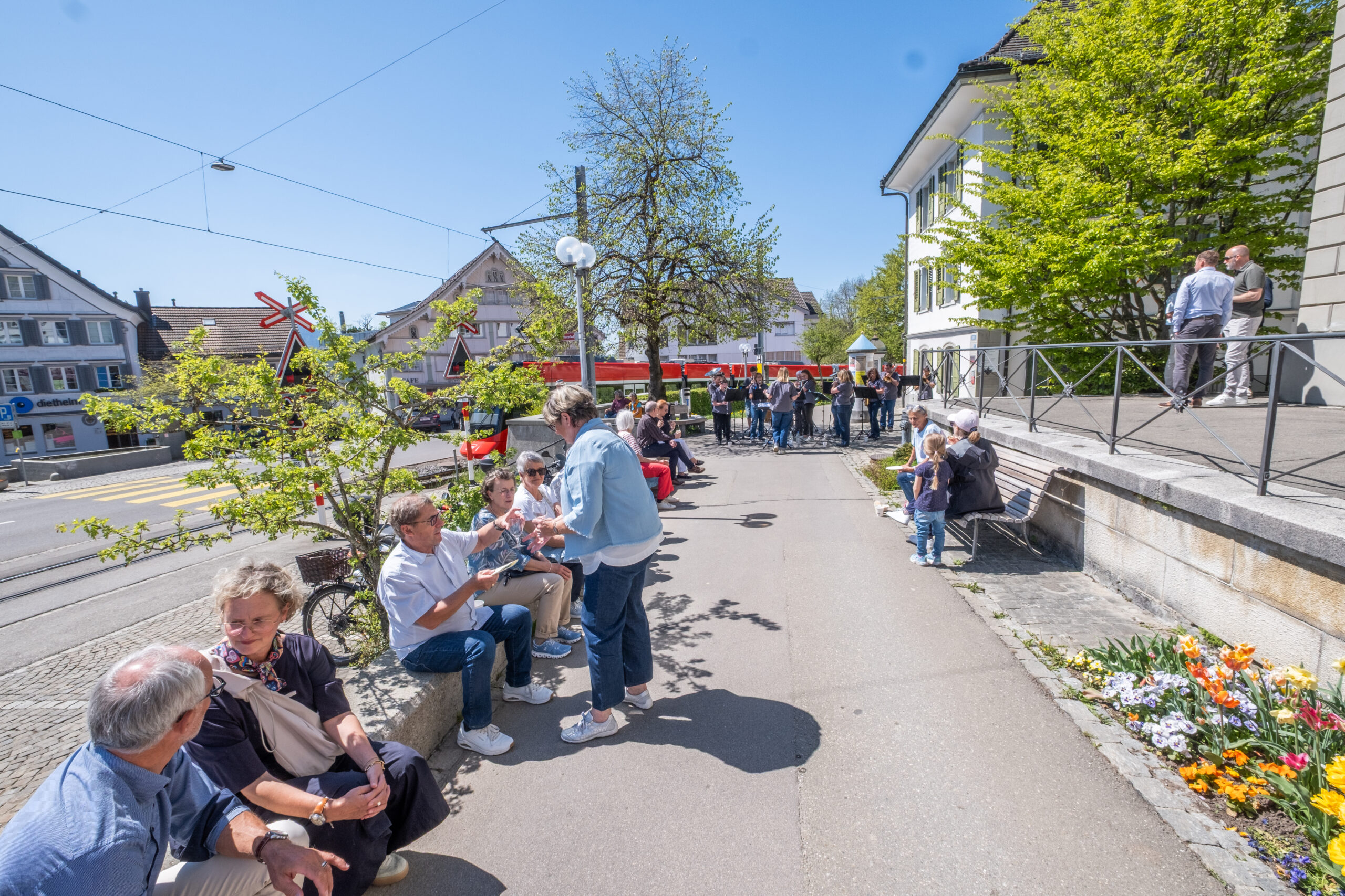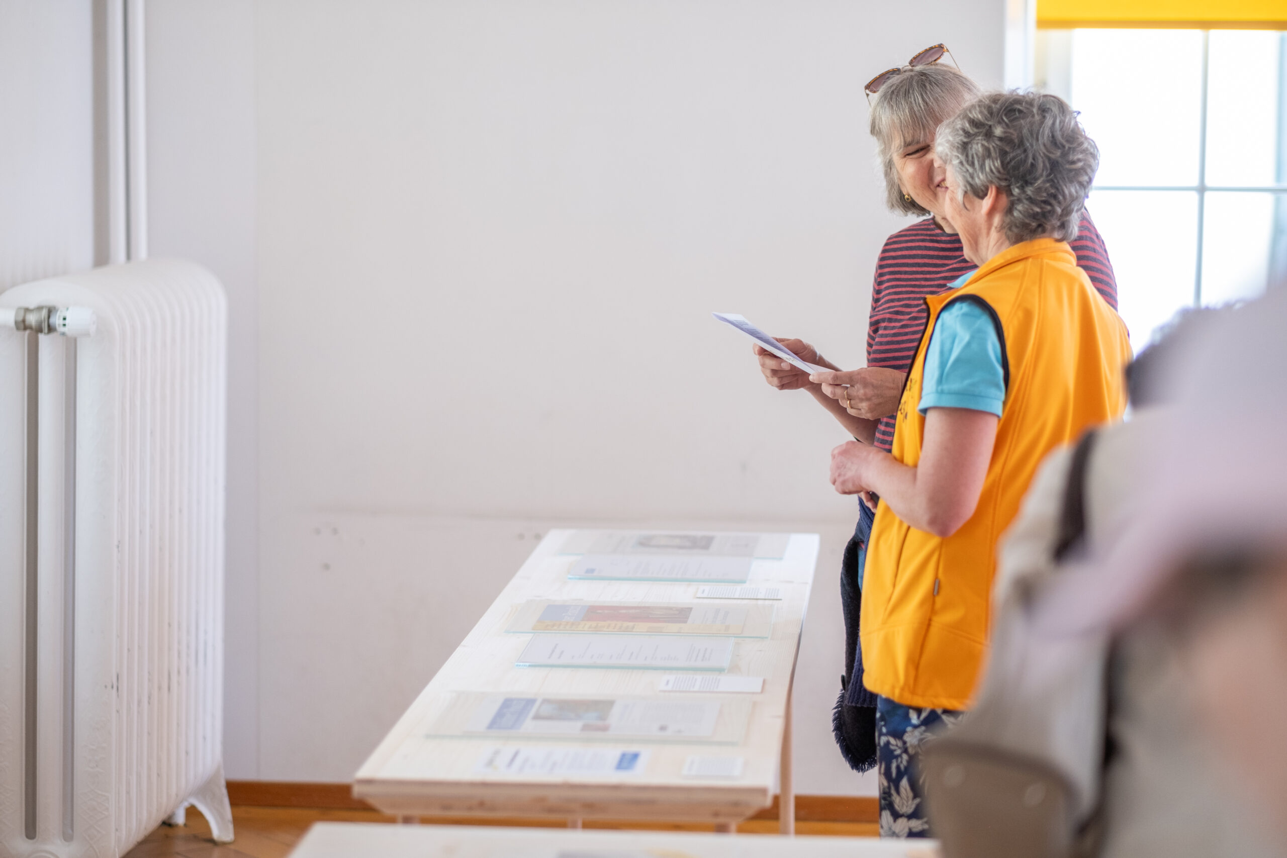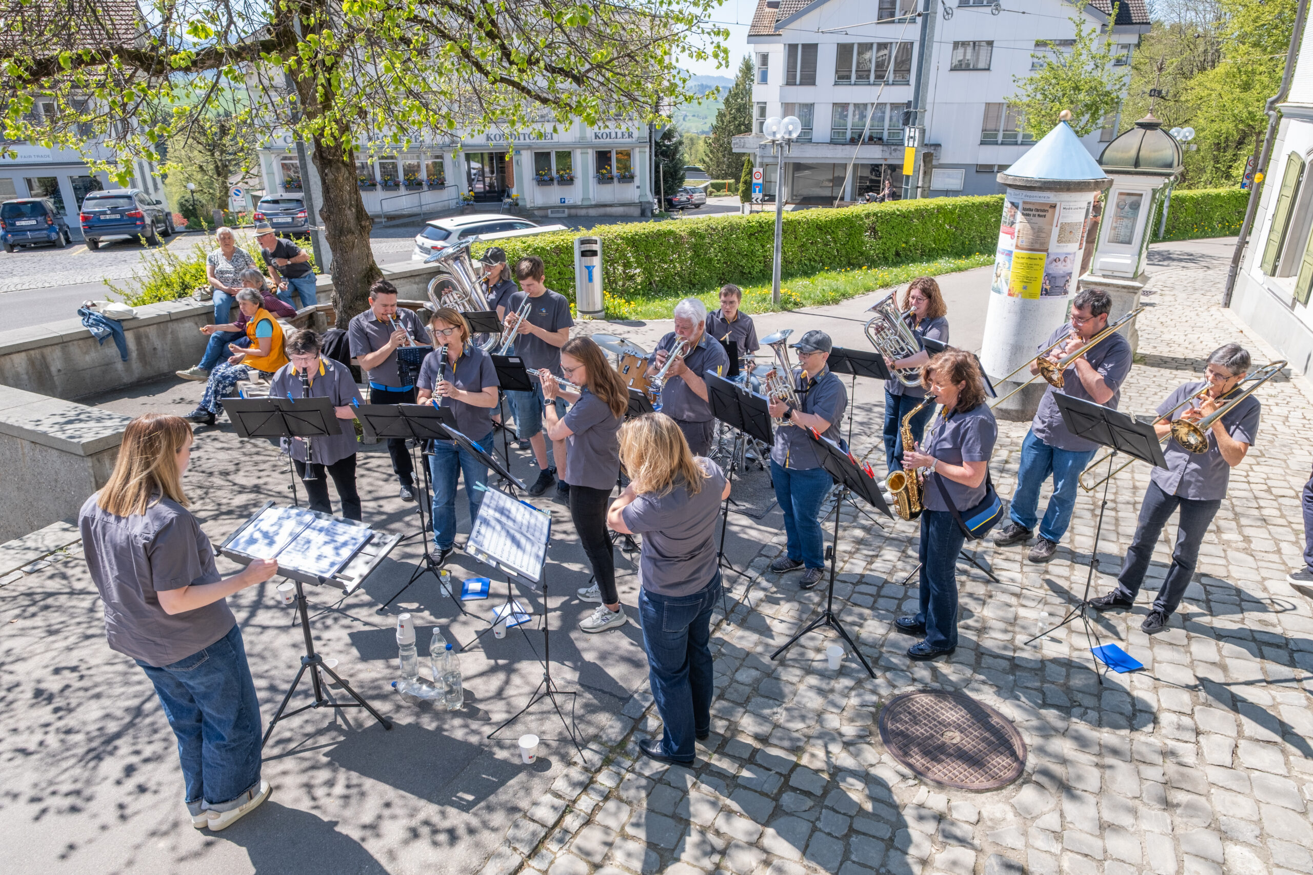 Zu den Klängen von Elias Menzi am Hackbrett machten sich die Besuchenden dann langsam auf in Richtung erster Stock zur Ausstellung. Kuratiert hatte diese David Glanzmann, der sich sonst um die Ausstellungen im Zeughaus kümmert. Seine Erfahrung ist auch beim Betrachten dieser Pop-up Ausstellung spür- und erlebbar. In einem Raum können Besuchende in «30 Geschichten aus 30 Jahren» stöbern, es gibt ein «Redaktionsbüro», in dem die Gäste um ihre Meinung zu den Inhalten der Tüüfner Poscht gebeten werden und in einem anderen Schulzimmer wird die Geschichte der Dorfzeitung dargestellt – in Text, Bild und Zeitungsausschnitten. «Ganz besonders möchte ich euch auch noch die Gerüchte-Ecke ans Herz legen. Dort können Sie Gerüchte entdecken, aber auch eigene ‘in die Welt setzen’», sagt Ursula von Burg noch, bevor sie die Gäste zu Speis, Trank und Platzkonzert (Harmoniemusik Teufen) entlässt.