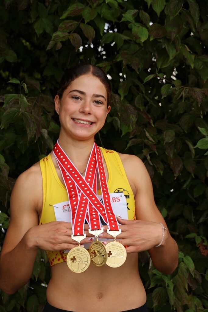 Als zweifache Medaillengewinnerin durfte sich in derselben Kategorie Mara Schwitter feiern lassen. Sie steigerte sich über die 100m-Hürden enorm. Nach neuer Bestzeit in den Vorläufen verbesserte sie sich Im Final weiter auf ausgezeichnete 13.52sec und gewann in einem starken Feld Bronze. Über 100m überzeugte die U18-Athletin mit der Silbermedaille in 11.78 sec und ermöglichte dem TV Teufen einen Doppelsieg.