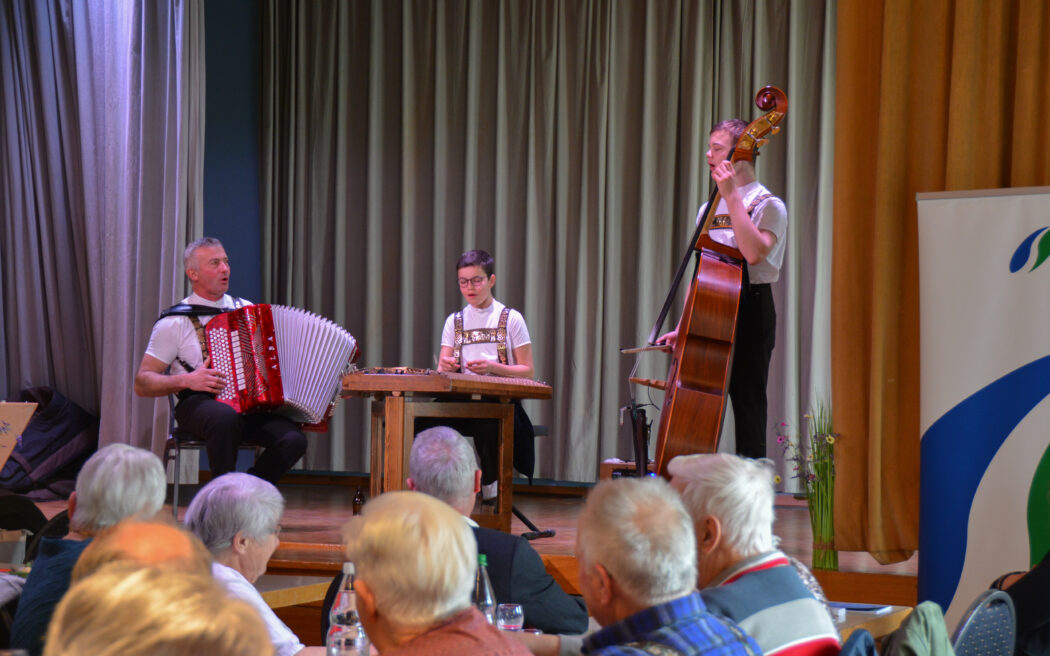 Da keine Anträge eingereicht worden waren, stand dem gemütlichen Ausklang nichts mehr im Weg. Die Familienkapelle Tüüfner Gruess, bekannt als Siegerformation 2021 der Talentshow Stadt Land Talent von SRF, spielte auf mit Handorgel, Hackbrett und Kontrabass und sang stimmungsvolle «Zäuerli». Das Kuchenbuffet wurde gestürmt und an den frühlingshaft dekorierten Tischen angeregt geplaudert. Es liess sich gut verweilen während draussen Windböen den Regen über den Dorfplatz peitschten.