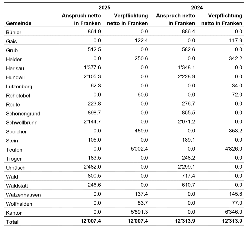Dieses Jahr erhalten dreizehn Ausserrhoder Gemeinden rund 12 Millionen Franken aus dem kantonalen Finanzausgleich. Finanziert werden diese Ausgleichszahlungen durch einen Kantonsbeitrag von 5,9 Millionen Franken; den Rest steuern sieben Gebergemeinden bei. Das scheibt die Kantonskanzlei in einer aktuellen Medienmitteilung.