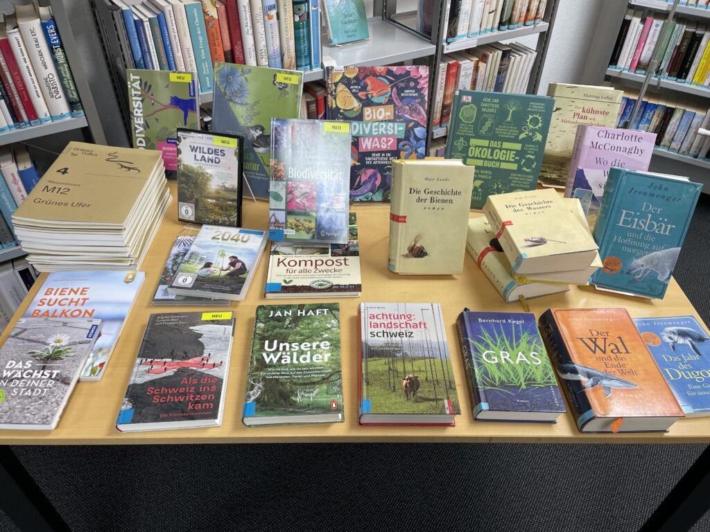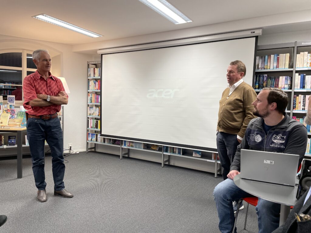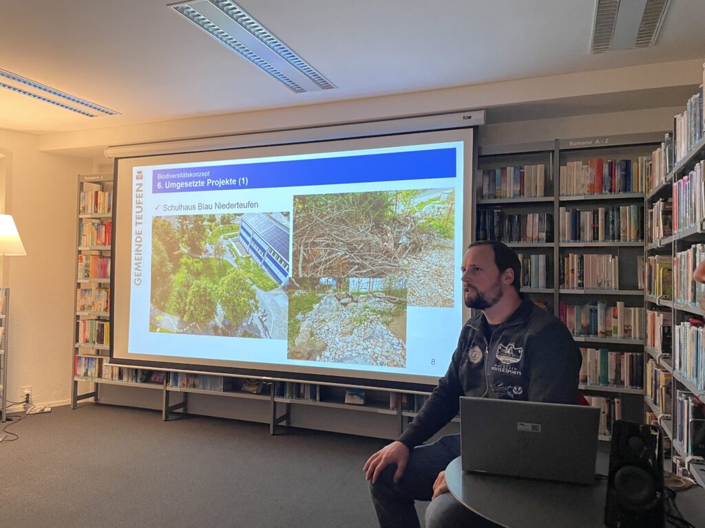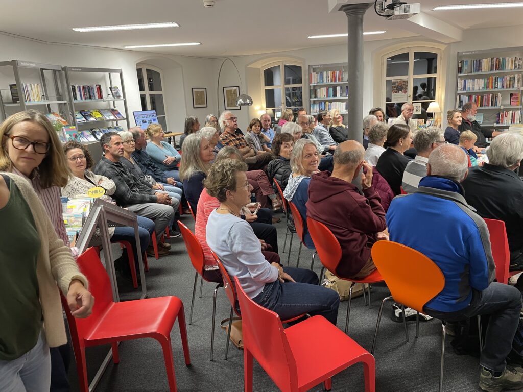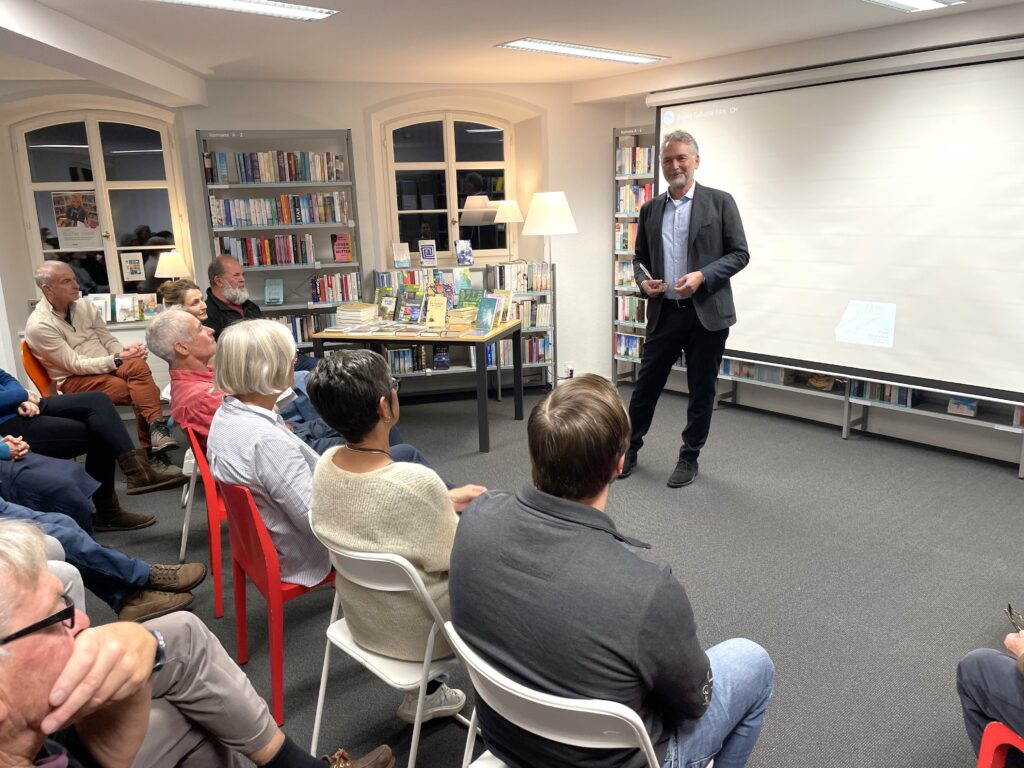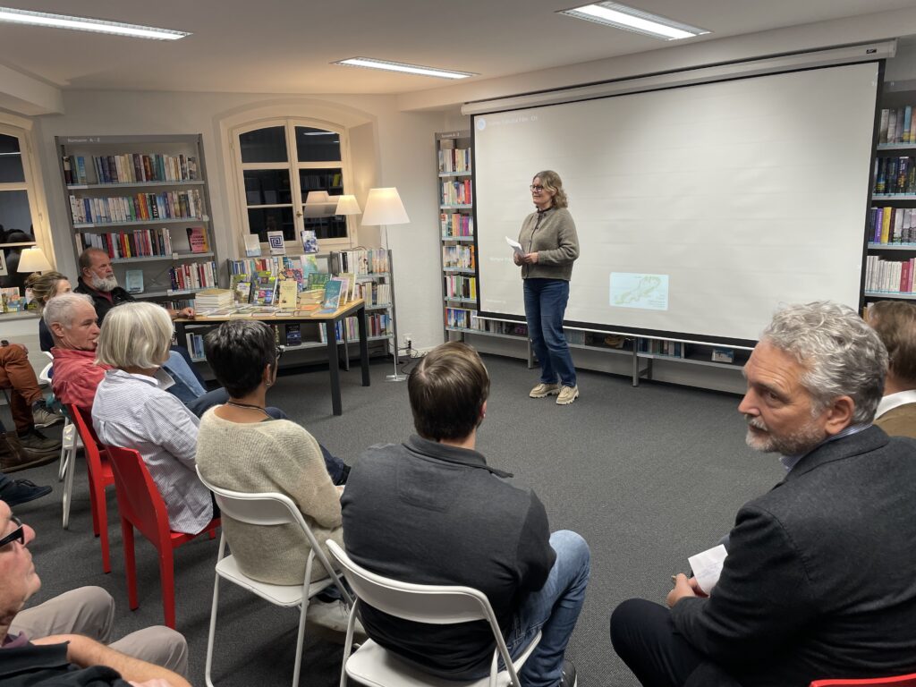 An diesem 29. Oktober, abends nach 19 Uhr schleppt das Team der Dorfbibliothek immer noch mehr Stühle herbei. Die Leiterin der Bibliothek, Karin Sutter, stellt den Raum zur Verfügung und begrüsst die gut 40 Personen im vollen Saal der Bibliothek mit sichtlicher Freude. Das Team hat einen ganzen Tisch mit Büchern zum Thema bereitgestellt. Gastgeberin ist die Aktion für Biodiversität: Lucia Andermatt, Andreas Kuster und Mägi Bischof. Alexander Assmus (GLP-Kantonsrat aus Teufen) führt durch den Abend.