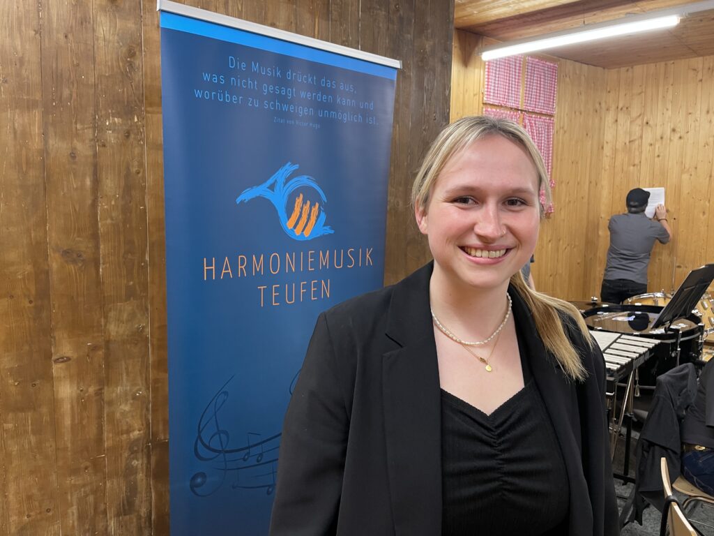 Die in Gais aufgewachsene und nun im Rheintal lebende Katja Hutter ist ein Talent. In ihrer Jugend spielte sie Klavier und sang. Auf Drängen ihres Vaters lernte sie später Klarinette und spielte schon nach drei Monaten Unterricht bei den Jungmusikern der Musikgesellschaft Kriessern mit. Das war 2018. In den vergangenen sieben Jahren hat sie Dirigierkurse absolviert und ist seit 2023 Dirigentin der Jungmusik Kriessern. Und seit den Sommerferien steht sie jetzt auch vor der Harmoniemusik Teufen. Ruhig, souverän und mit klaren Gesten führt sie die Musizierenden durch ein vielfältiges Programm.