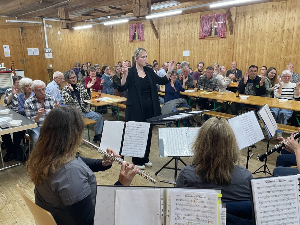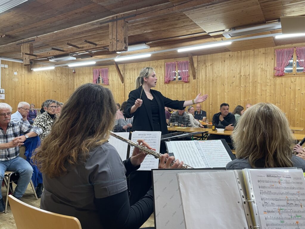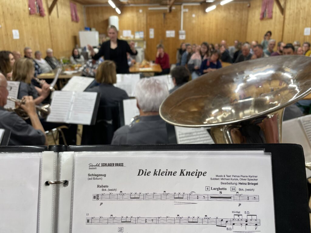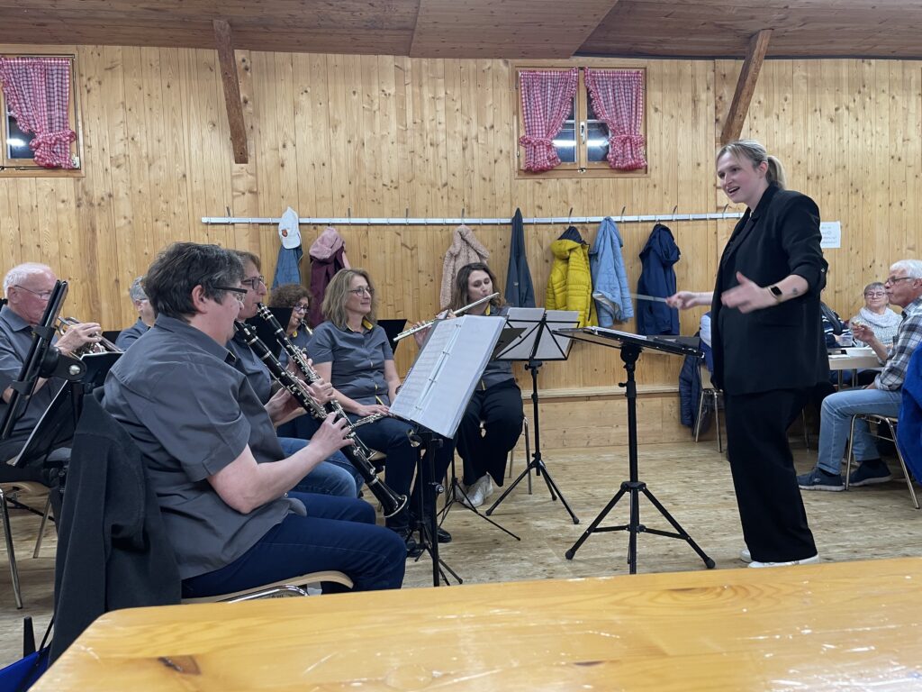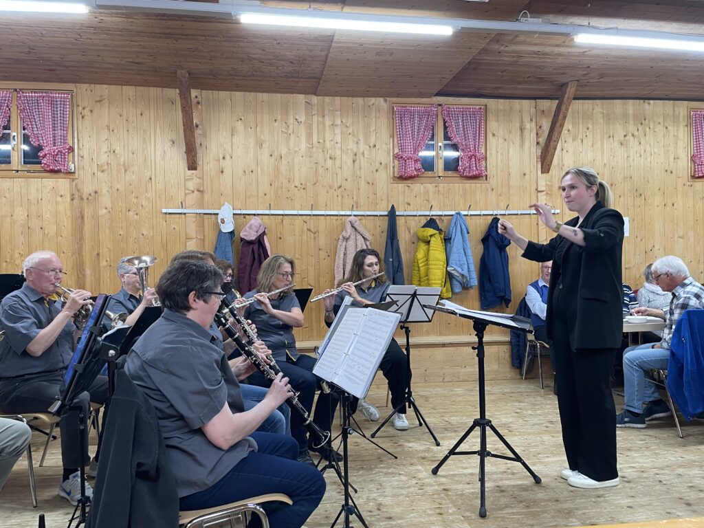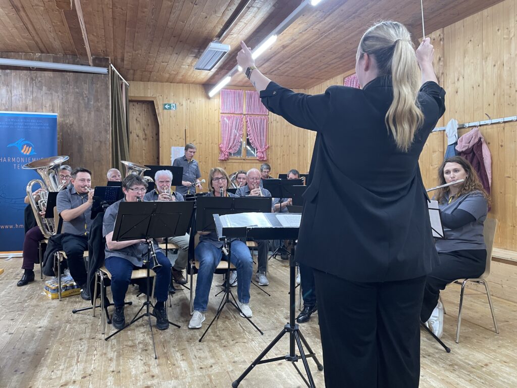 Es herrscht eine lockere und familiäre Atmosphäre an diesem Mittwochabend. Man kennt sich, man plaudert und versorgt sich mit Getränken, bevor es losgeht mit dem Musikprogramm. Der Vizepräsident Dawid Meier ist Taktgeber des Abends. Ganz wörtlich tut er das auf dem Schlagzeug, er führt aber auch gekonnt und humorvoll durch den Abend. Er begrüsst die Gäste, macht Ansagen zu den einzelnen Stücken und stellt die neue Dirigentin detailliert vor – sogar mit Angabe der Noten bei den Dirigierkursen! Die sympathische junge Dirigentin nimmt’s mit Humor.