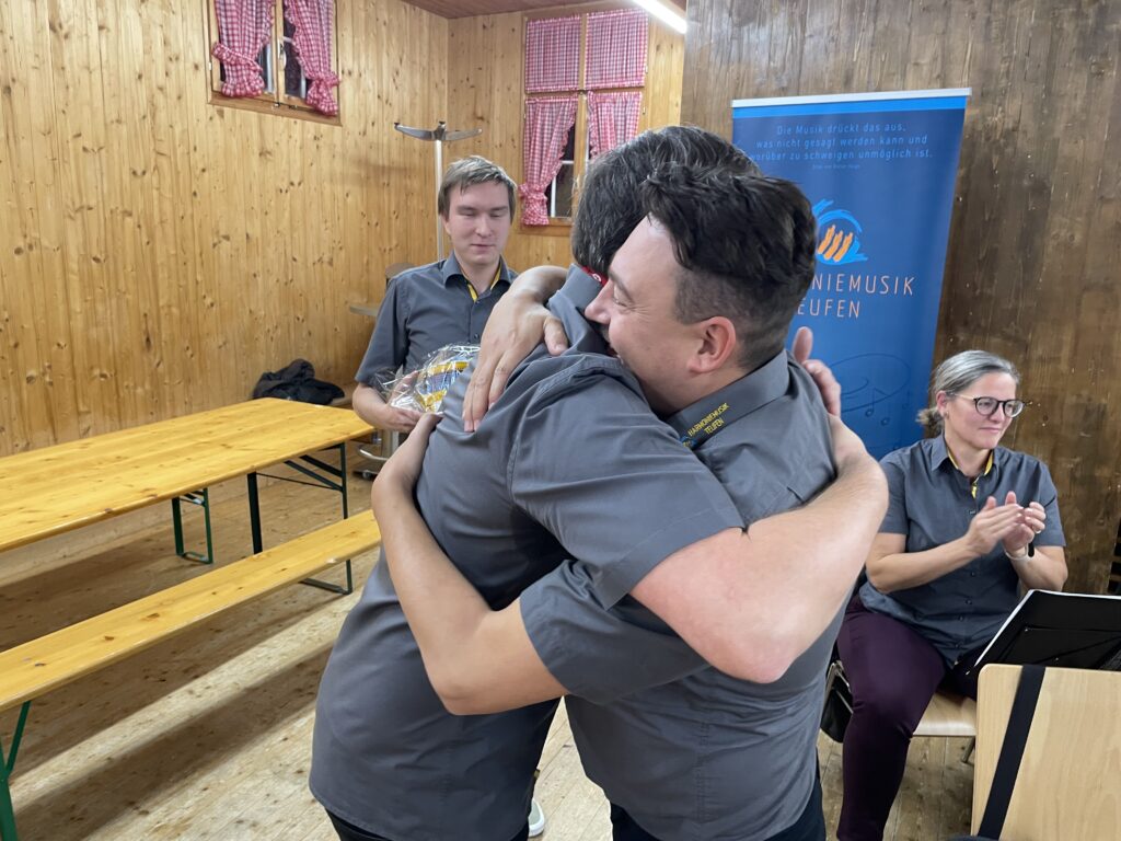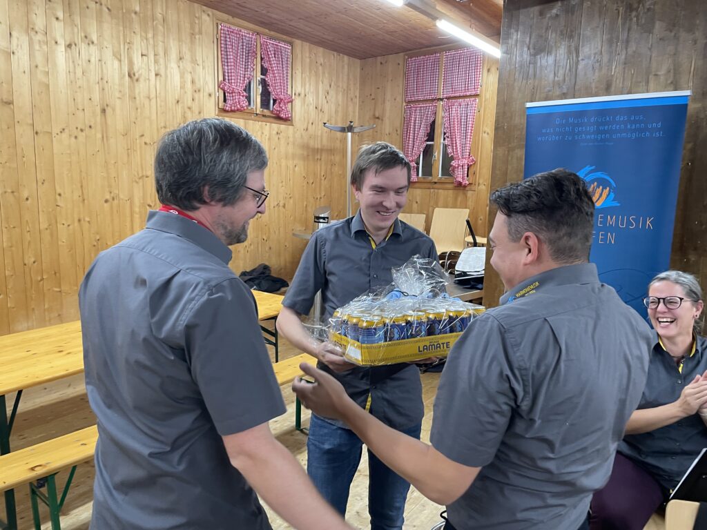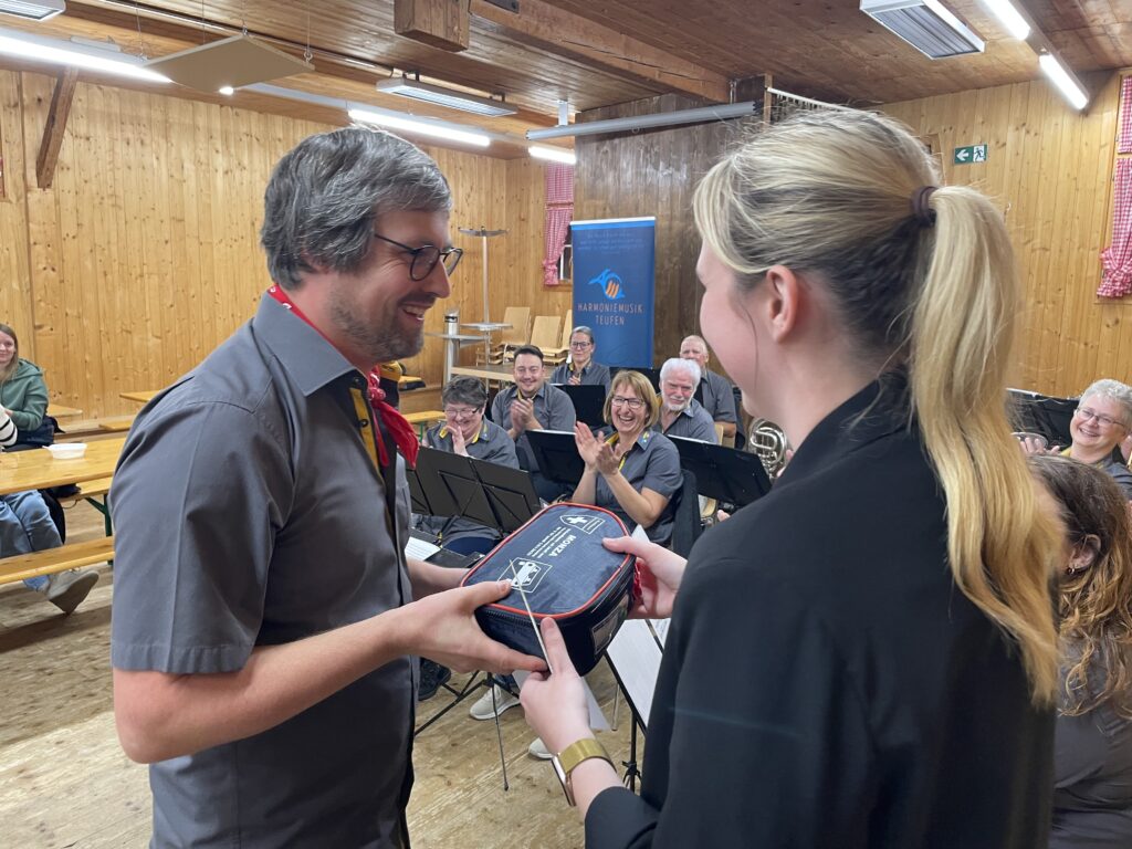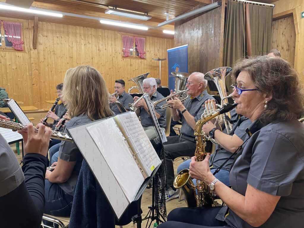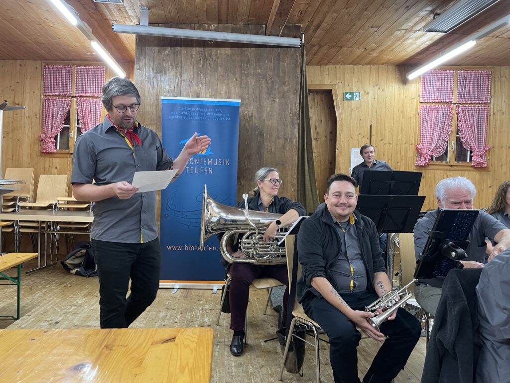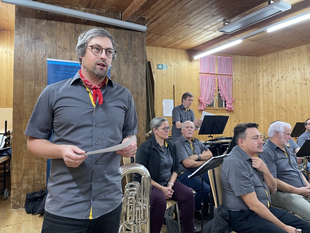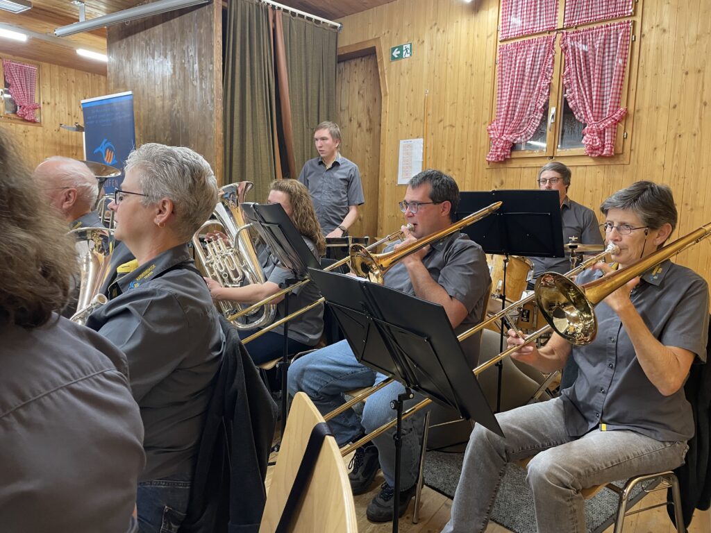 Es herrscht eine lockere und familiäre Atmosphäre an diesem Mittwochabend. Man kennt sich, man plaudert und versorgt sich mit Getränken, bevor es losgeht mit dem Musikprogramm. Der Vizepräsident Dawid Meier ist Taktgeber des Abends. Ganz wörtlich tut er das auf dem Schlagzeug, er führt aber auch gekonnt und humorvoll durch den Abend. Er begrüsst die Gäste, macht Ansagen zu den einzelnen Stücken und stellt die neue Dirigentin detailliert vor – sogar mit Angabe der Noten bei den Dirigierkursen! Die sympathische junge Dirigentin nimmt’s mit Humor.
