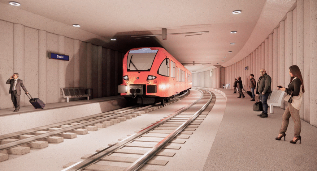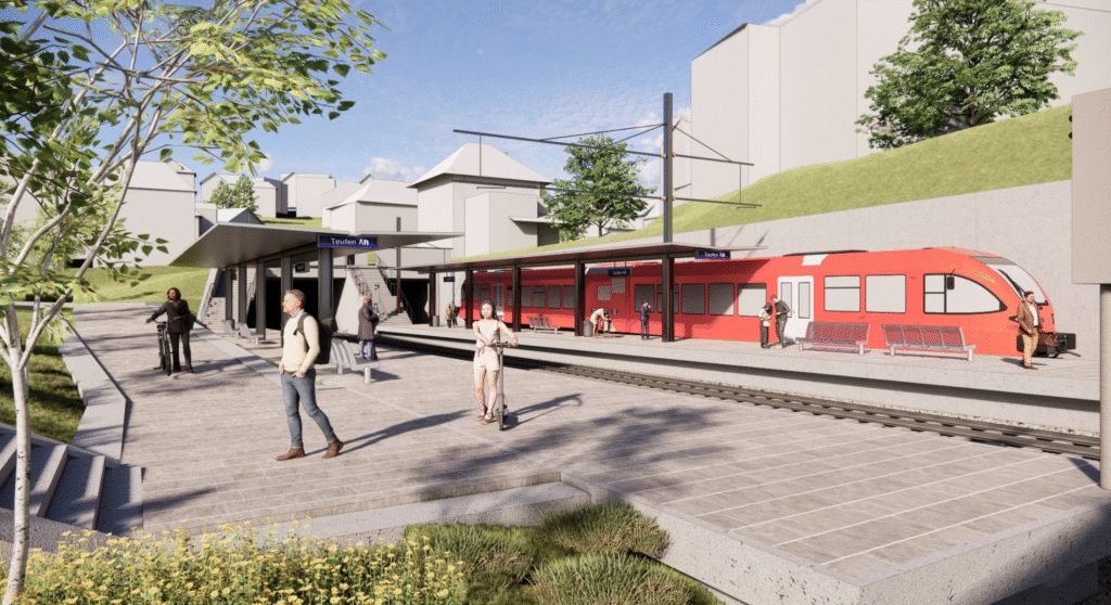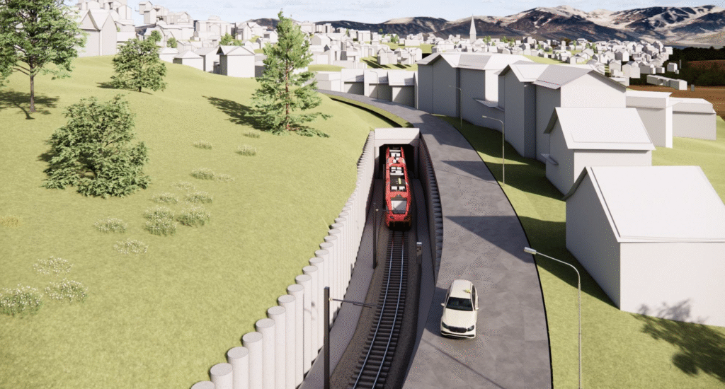 Die Geometrie und Streckenführung sind nun fix. Der einspurige Tunnel vom Bahnhof bis zur unterirdischen Haltestelle Stofel soll rund 950 Meter lang werden. Dort wird die Streckenführung zweigleisig, inkl. Perrons an beiden Gleisen, und der Tunnel wird in Tagebauweise (Deckelbau) unterhalb der Hauptstrasse weitergeführt, bevor er eingleisig wird und im Bereich des Eggliranks wieder an die Oberfläche kommt. In diesem Bereich will die Gemeinde zudem einen Streifen Land von 4 Metern von den privaten Grundstückbesitzern erwerben – das würde mehr Platz für die Strasse schaffen.