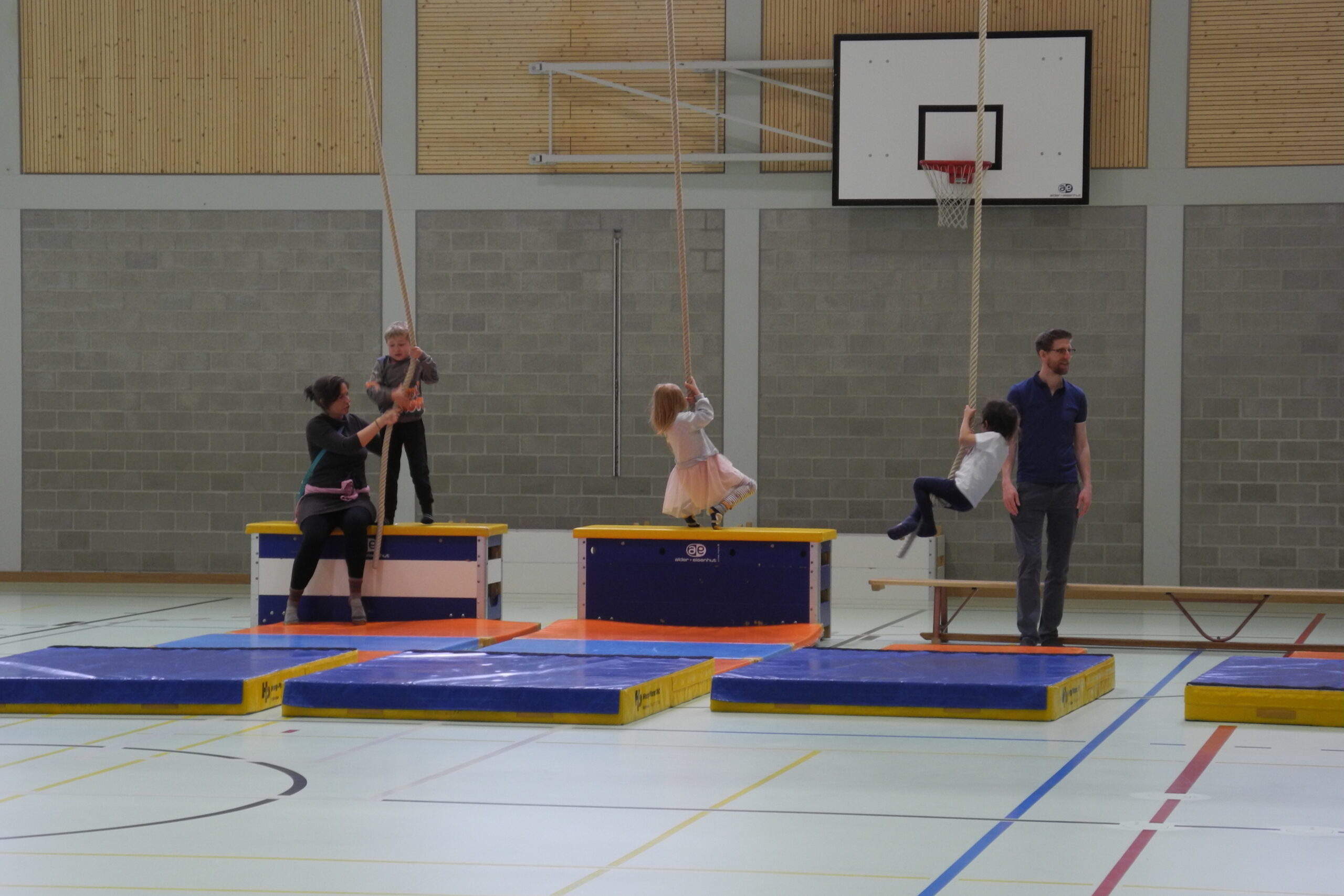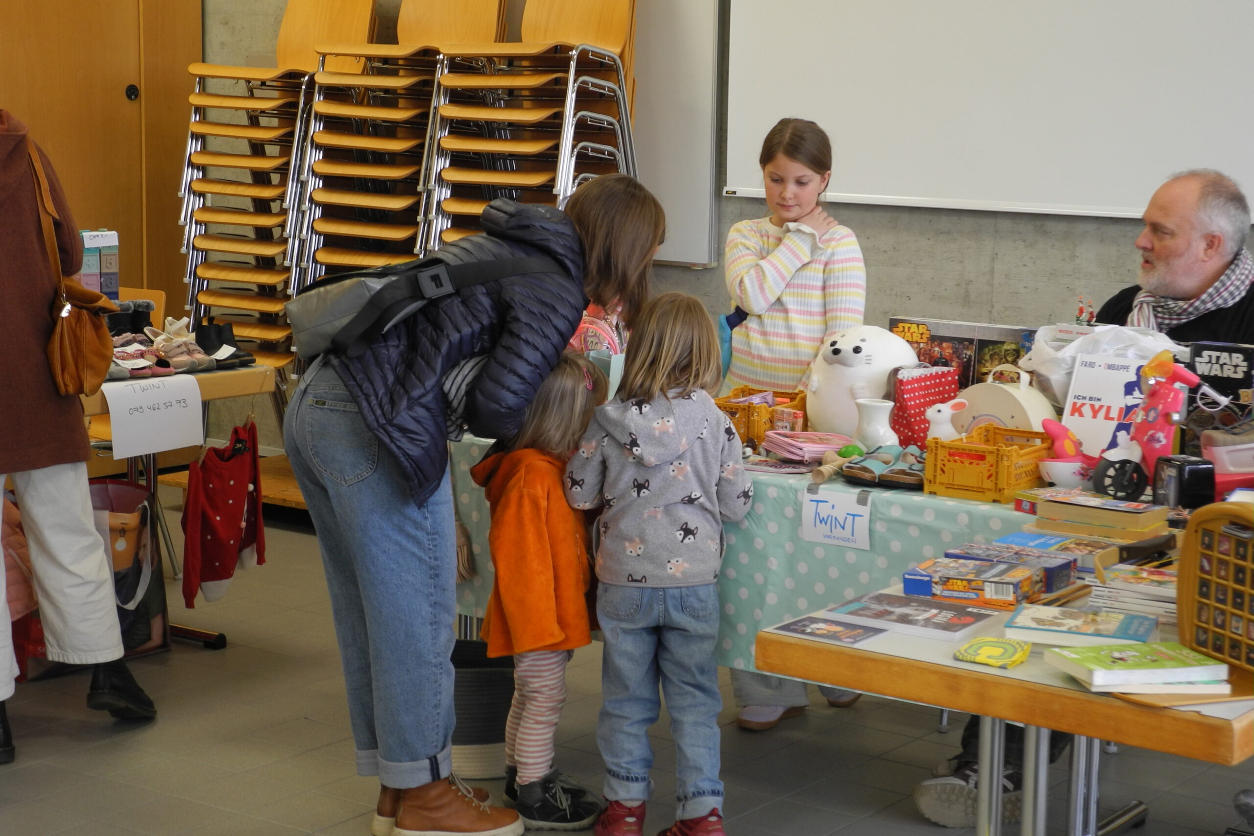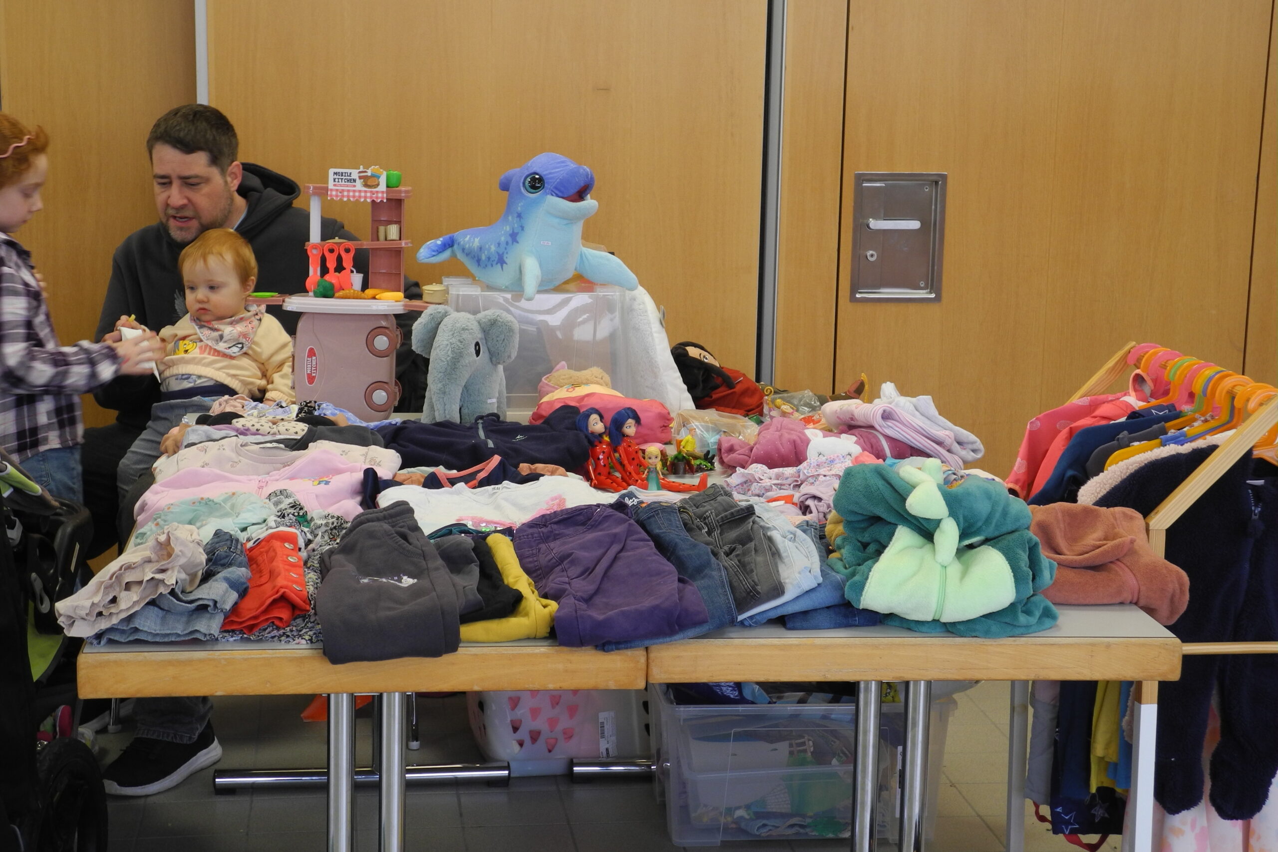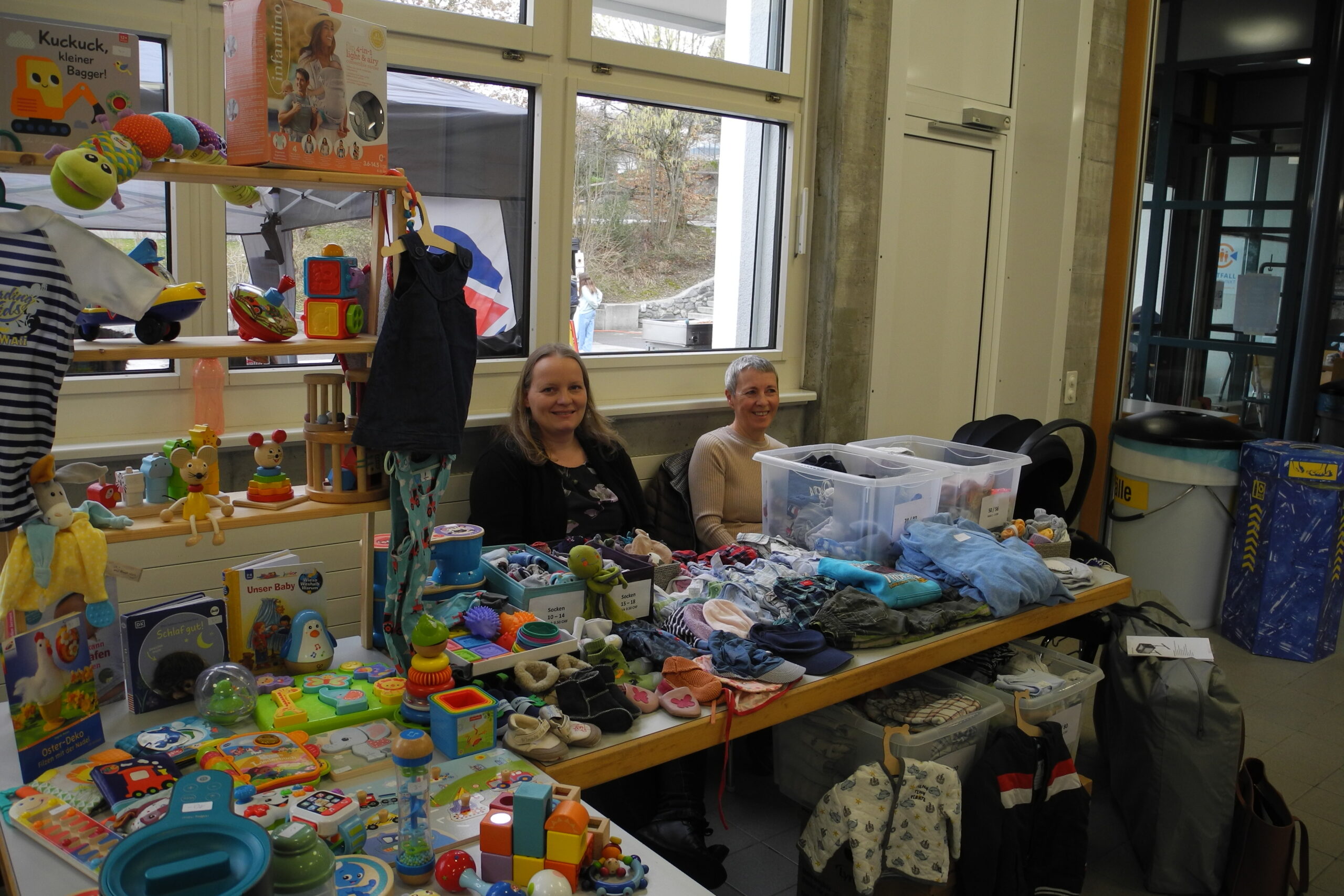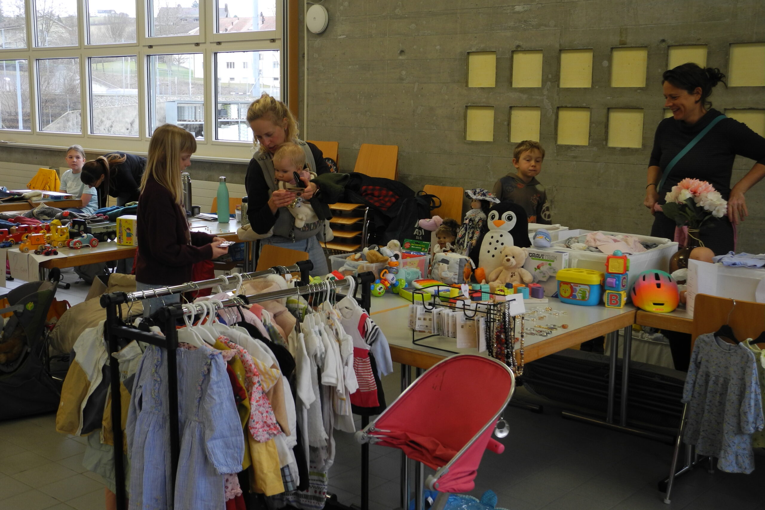 In der Sporthalle Landhaus hatten Kinder im Alter von 3 bis 6 Jahren mit ihren Eltern Gelegenheit, zusammen zu spielen und sich in einer ungezwungenen Atmosphäre zu bewegen. Beliebt waren die Seile, an denen sich die Kinder hin und her schwangen. Im Eingang verkauften Mütter an ihren Ständen die vielen Kleider, Spielsachen und Bilderbücher, die sie nicht mehr brauchen. Da wurde gestöbert, verglichen und gehandelt.