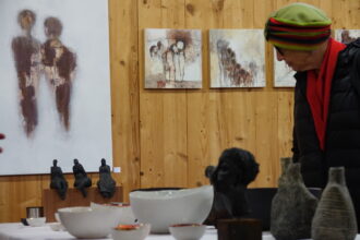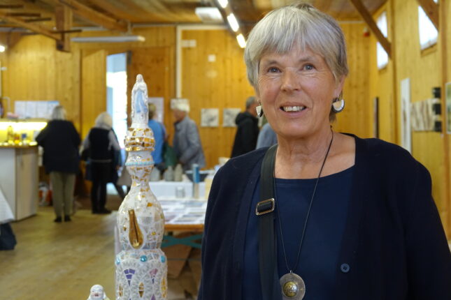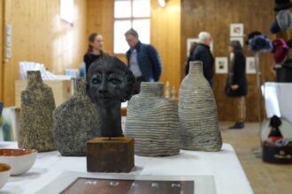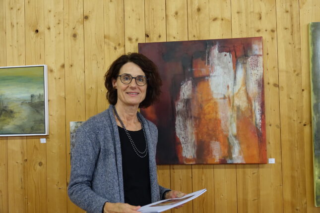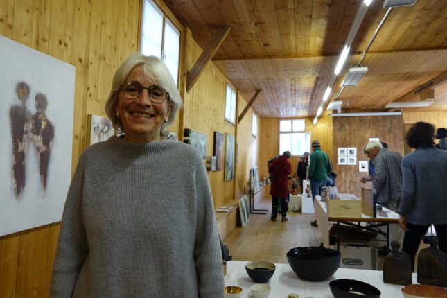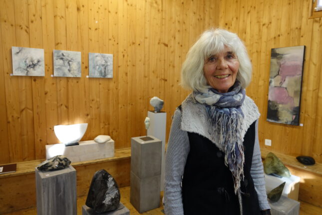 Doris Müller steht bei Ihren Steinskulpturen und erzählt Interessierten von ihrer Arbeit mit den Steinen. Am Samstagnachmittag ist viel Betrieb in der Hechtremise und die Besucherinnen und Besucher nutzen die Gelegenheit mit den anwesenden Künstlerinnen zu sprechen. Bereits haben einige Bilder und Werke rote Punkte angeheftet, zum Zeichen, dass sie verkauft sind.
