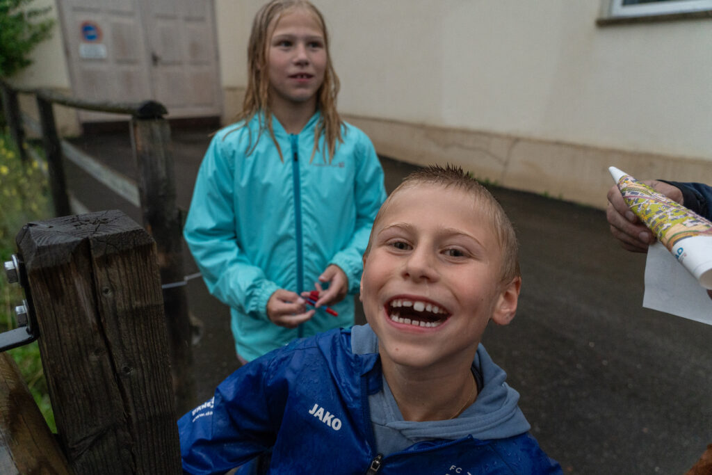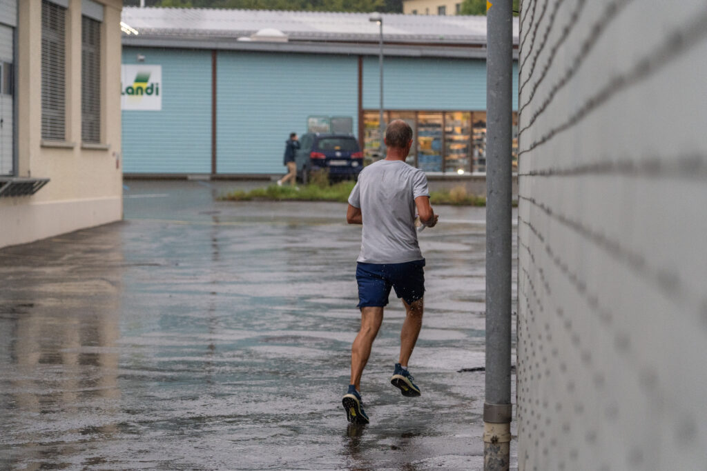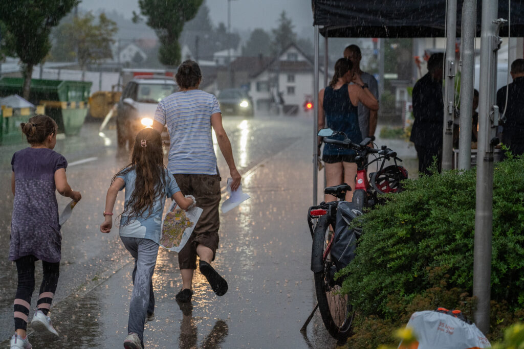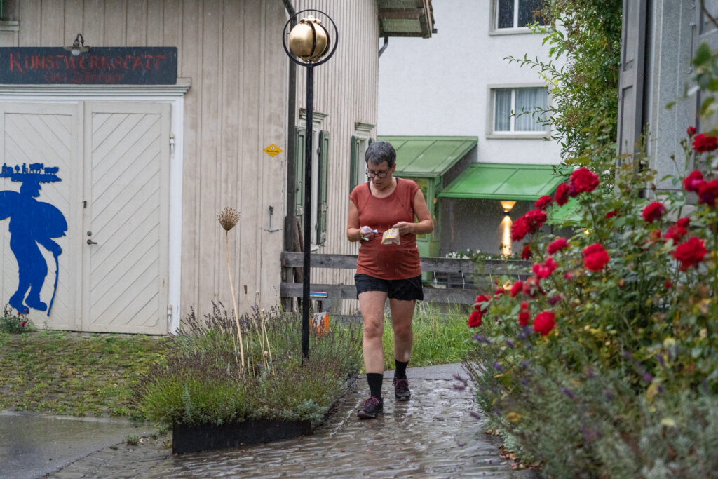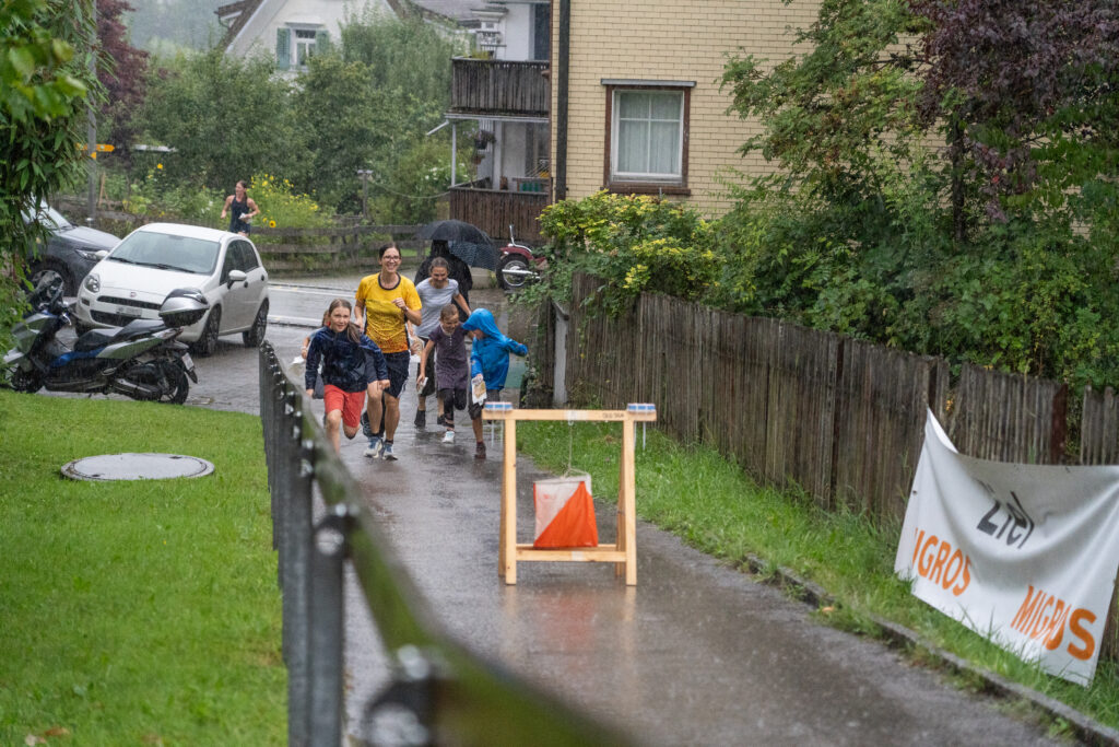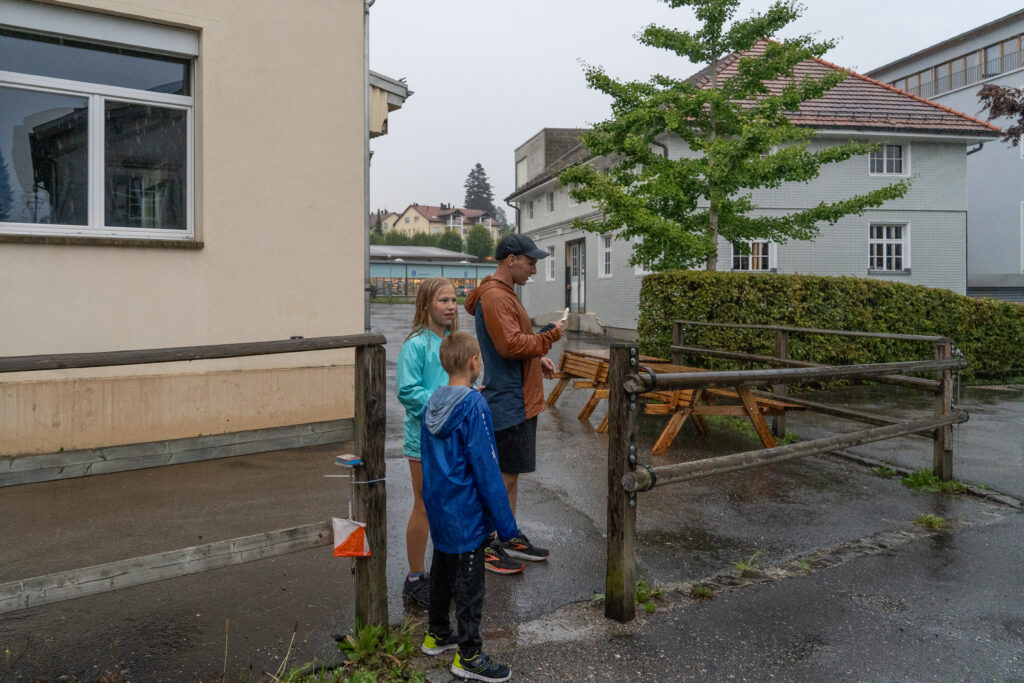Wäre da nur nicht diese Gewitterzelle. Schon kurz vor Beginn des Anlasses sind am Himmel Blitze zu sehen. Die ersten Tropfen fallen. Den OL-Menschen scheint das aber nicht viel anzuhaben. Sie nehmen es mit Humor: «Wir sind ja wasserfest», sagt eine Helferin. Und: «Hoffen wir, wir werden nicht allzu nass.» Daraus wird aber leider nichts. Aus den Tropfen wird innerhalb einer halben Stunde intensiver Regen. Es scheint «aus Kübeln» zu regnen. Lachende Gesichter sind trotzdem überall zu sehen. Zwischen den Häusern, wo die Posten verteilt sind. Und im Ziel beim Bahnhof.