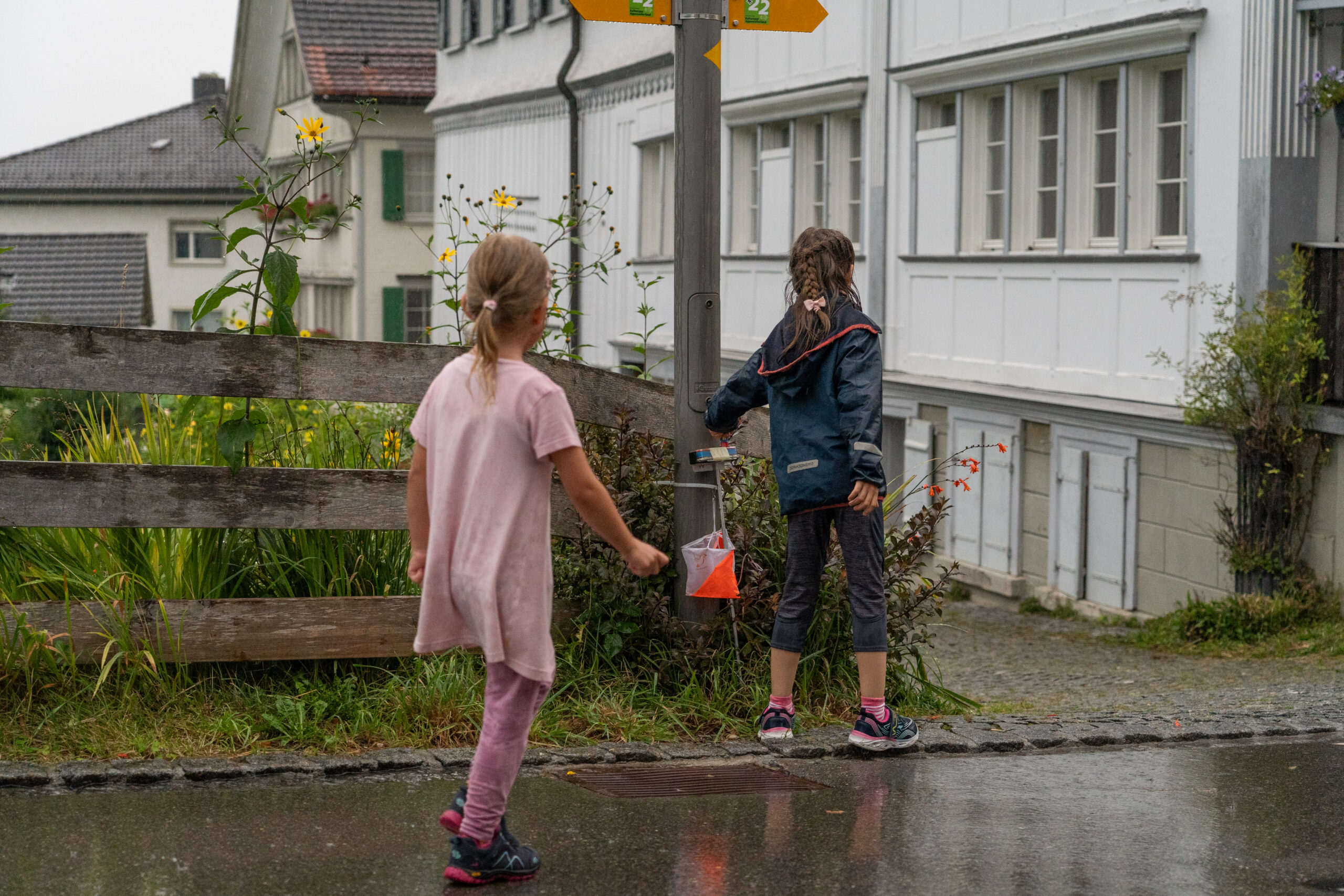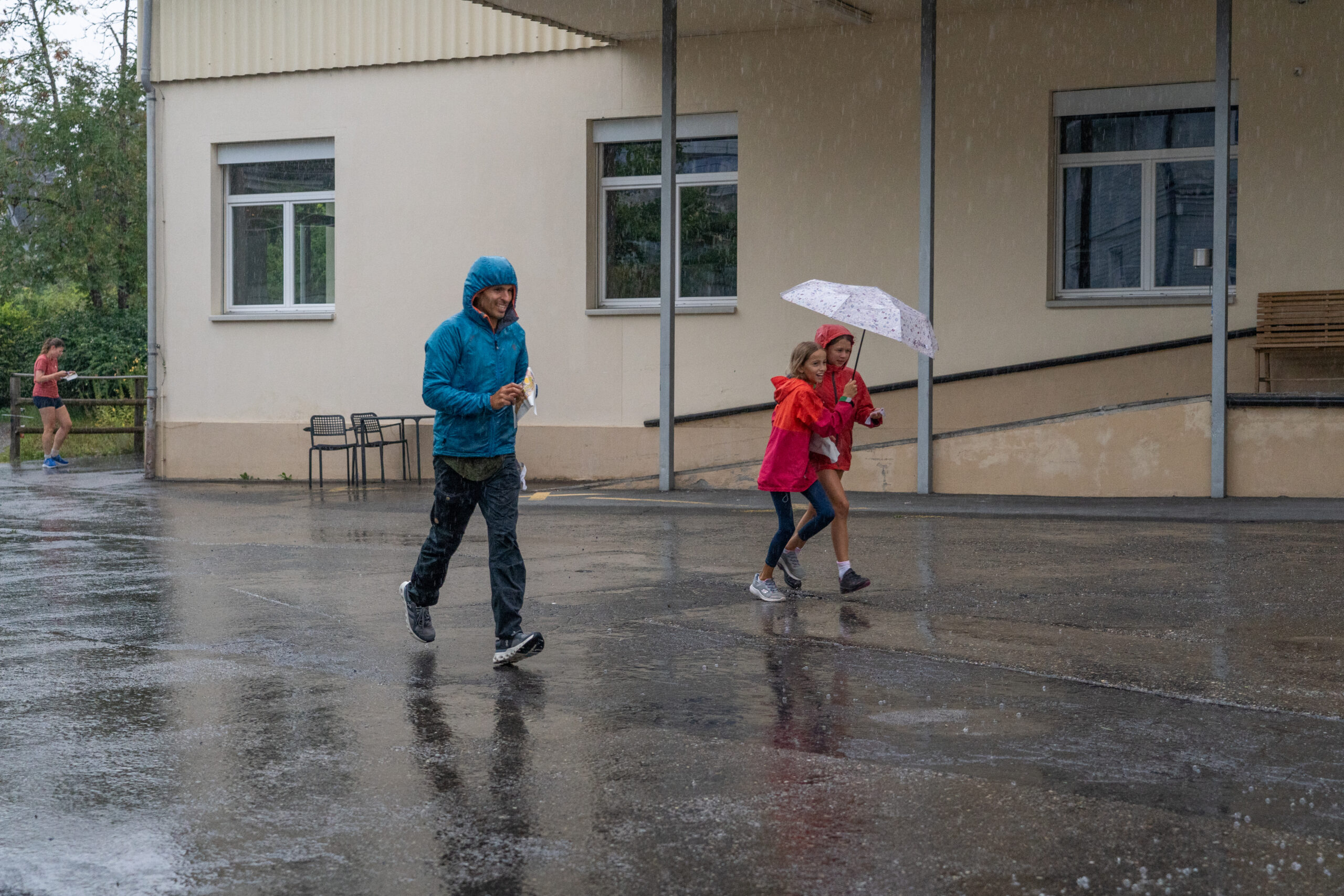 Wäre da nur nicht diese Gewitterzelle. Schon kurz vor Beginn des Anlasses sind am Himmel Blitze zu sehen. Die ersten Tropfen fallen. Den OL-Menschen scheint das aber nicht viel anzuhaben. Sie nehmen es mit Humor: «Wir sind ja wasserfest», sagt eine Helferin. Und: «Hoffen wir, wir werden nicht allzu nass.» Daraus wird aber leider nichts. Aus den Tropfen wird innerhalb einer halben Stunde intensiver Regen. Es scheint «aus Kübeln» zu regnen. Lachende Gesichter sind trotzdem überall zu sehen. Zwischen den Häusern, wo die Posten verteilt sind. Und im Ziel beim Bahnhof.