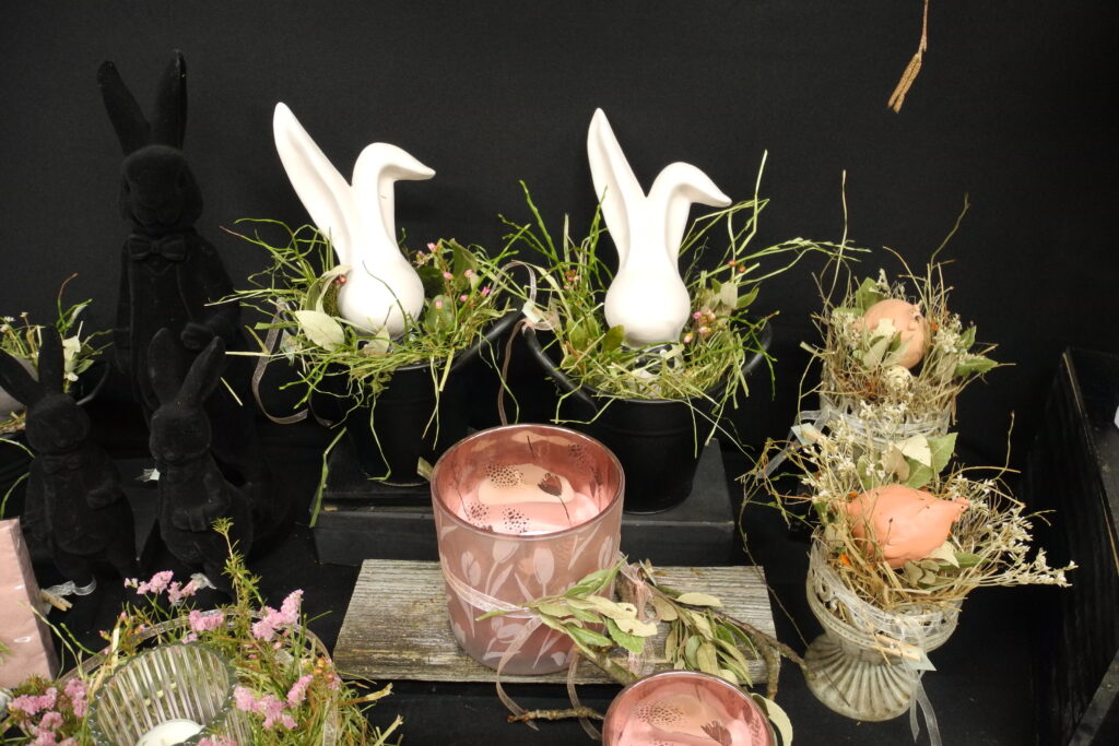 Wiederum haben die Ausstellerinnen ihre selbstgemachten Ostergestecke und Kränze – dekoriert mit kleinen und grossen Hasen – ausgestellt.