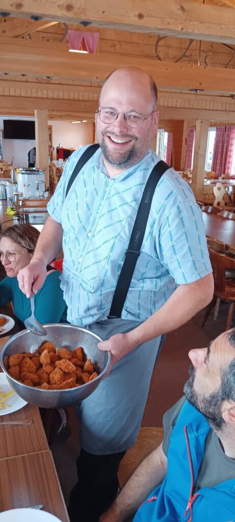 Zur Mittagszeit kehrte die Gruppe im Berggasthaus Schwänzelegg ein. Dort wurden die Kinder mit Chicken-Nuggets und Pommes verpflegt, was grossen Anklang fand und neue Energie für den Nachmittag lieferte.