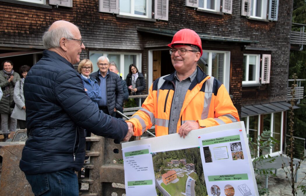Der Teufener Gemeindepräsident Reto Altherr wünscht Bauleiter Roger Wälchli viel Erfolg und verspricht, zum geplanten Buch über "Hätschen: gestern – heute – morgen" das Vorwort zu verfassen. Fotos: Matthias Wagner
