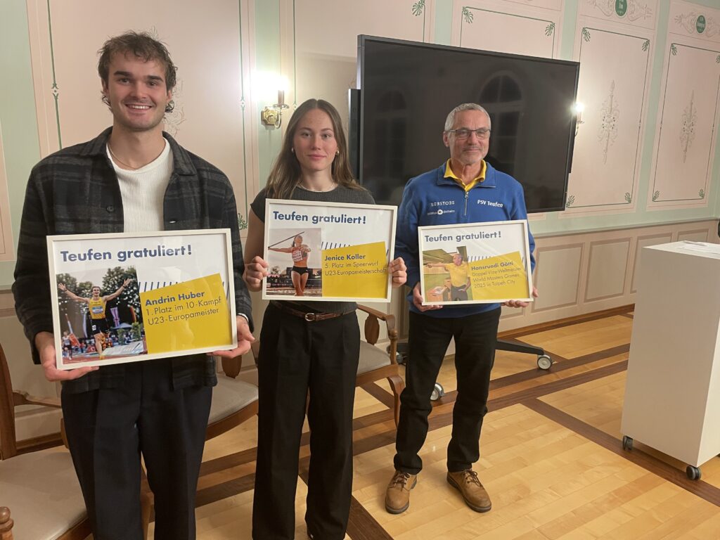 Jenice Koller, Andrin Huber und Hansruedi Götti wurden am Montagabend mit Angehörigen und Freunden im Gemeindehaus empfangen. Sie alle haben dieses Jahr herausragende sportliche Leistungen erbracht. Gemeindepräsident Reto Altherr hielt eine Ansprache und anschliessend gab es einen gemeinsamen Apéro, um noch einmal auf den Erfolg anzustossen.