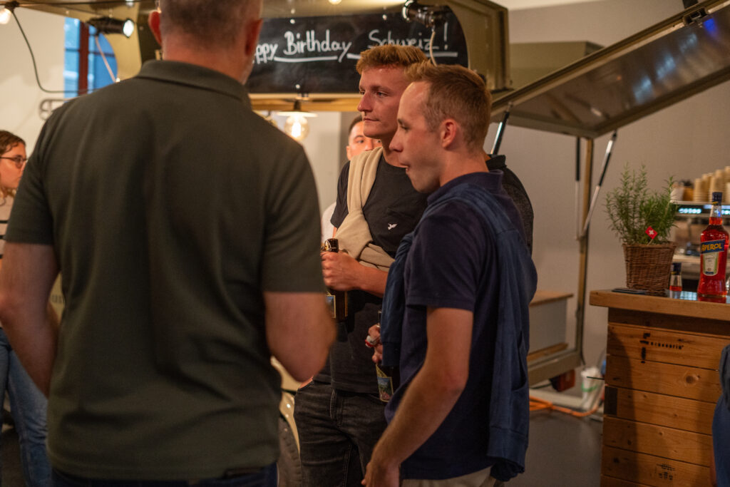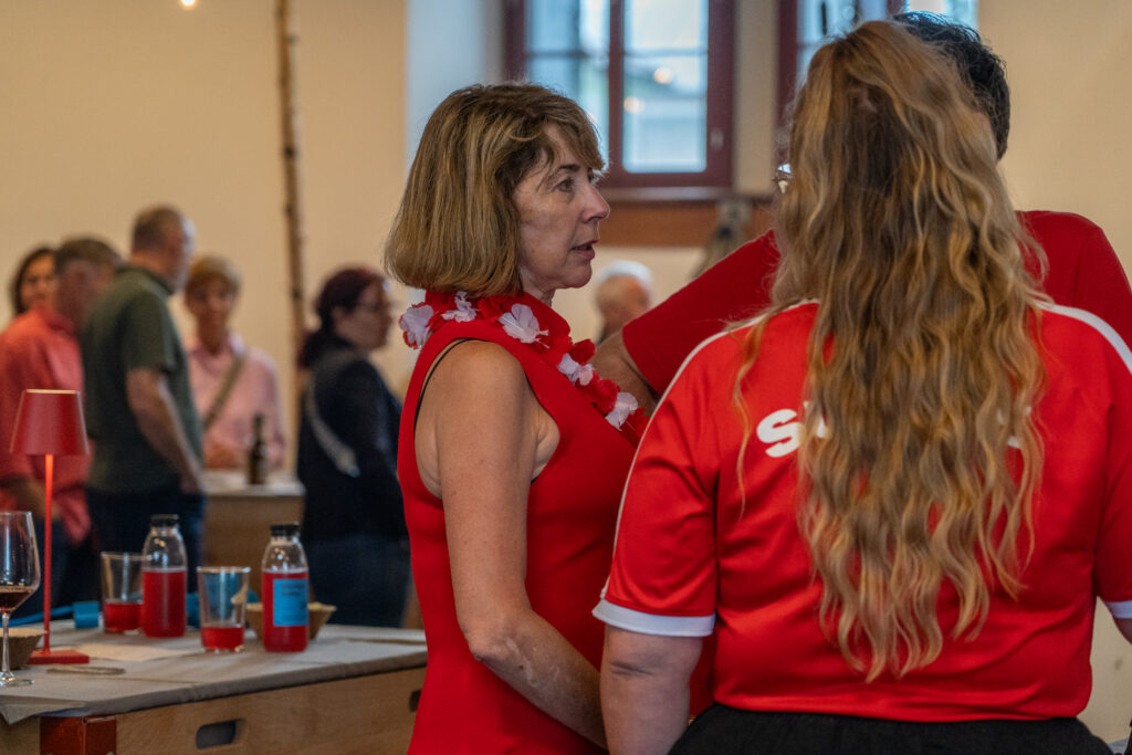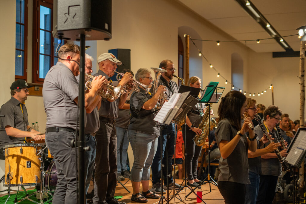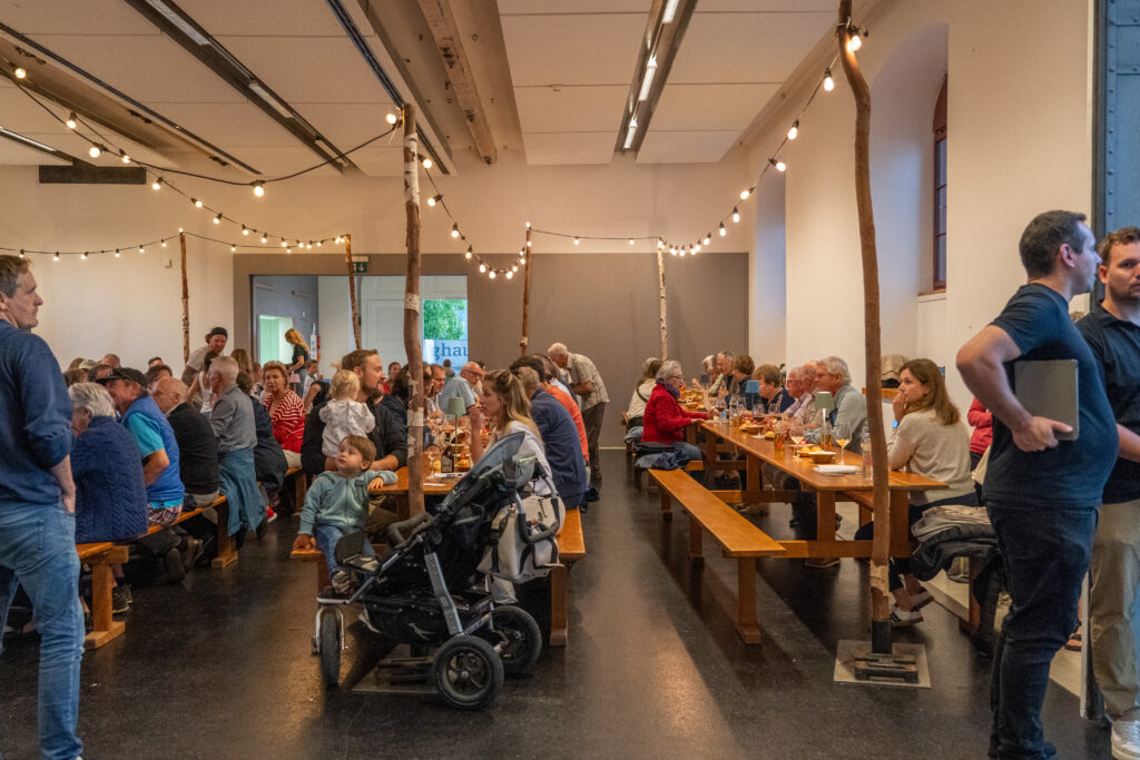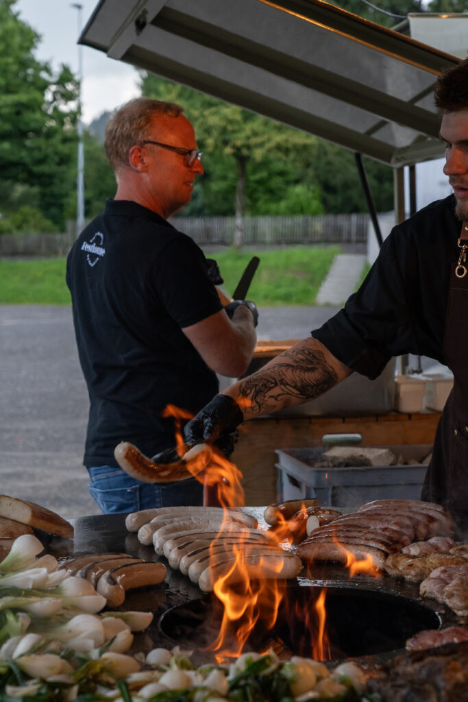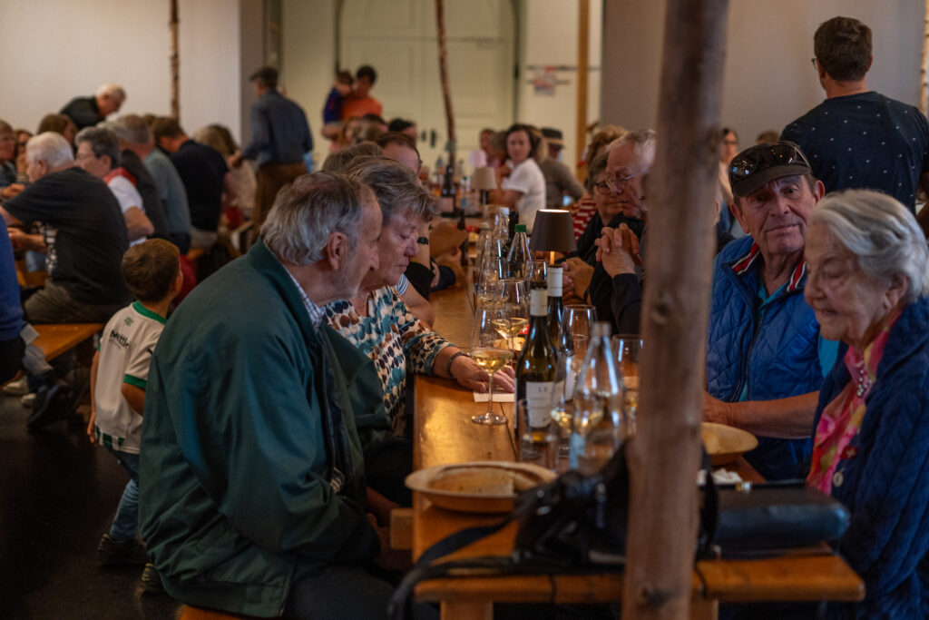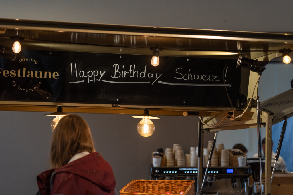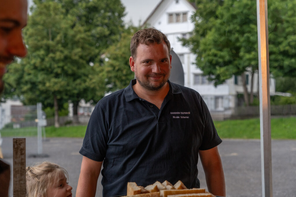 Als die Feier um 18 Uhr beginnt, hat sich der Himmel bereits verdunkelt. Kurze Zeit später fallen dicke Tropfen vom Himmel, ein Sommergewitter. Im Zeughaus verbreiten viele Glühbirnen und Lämpchen festliche Stimmung. «festlaune by foccaceria» sorgt auch dieses Jahr wieder für den kulinarischen Teil und ein stimmiges Ambiente. An den Tischen haben sich bereits einige Besucher und Besucherinnen versammelt. Schon werden die ersten Teller mit dampfendem Fleisch und Risotto reingebracht. Bald stimmt die Harmoniemusik ihr erstes Stück an. Gemeinderat Samuel Fischer lobt in einer kurzen Ansprache die lebendige Gemeinde, danach wird die Nationalhymne gespielt. Begleitet von der Harmoniemusik singen die Anwesenden die erste Strophe der Hymne, darauf folgt das Landsgemeindelied. Später wird das traditionelle Feuer entzündet. Dieses Jahr ist es allerdings kein klassisches Höhenfeuer. Denn die mächtigen Holzscheiter sind direkt vor dem Zeughaus aufeinandergestapelt. So soll das gemütliche Fest noch etwas kompakter werden.