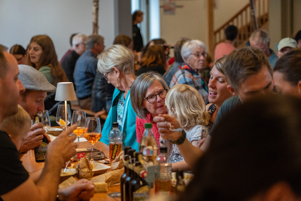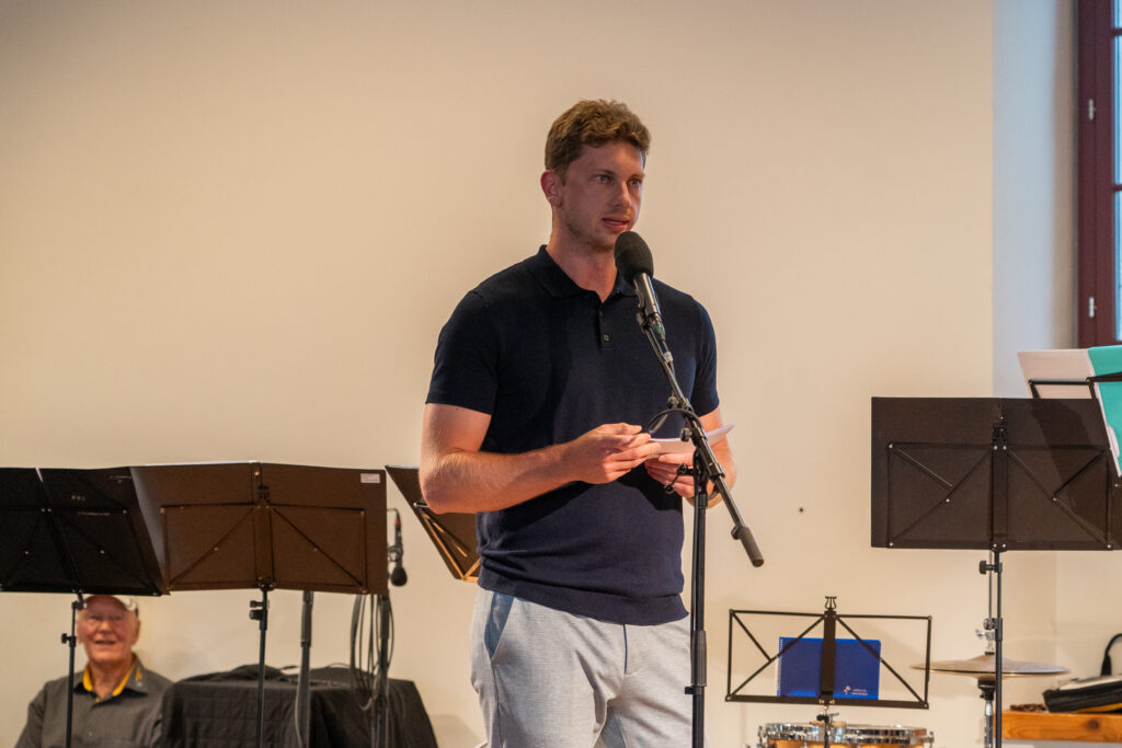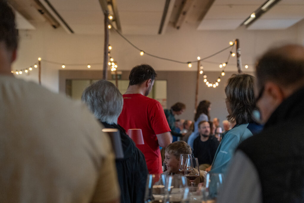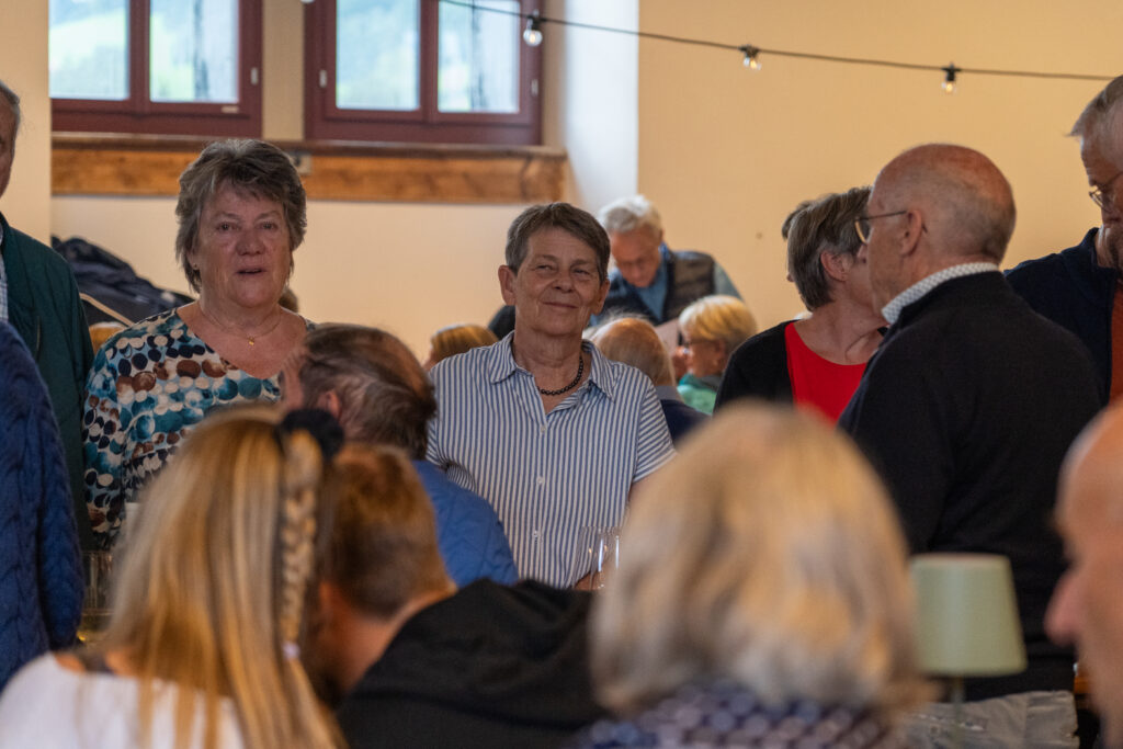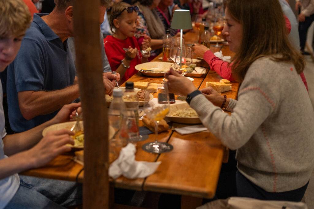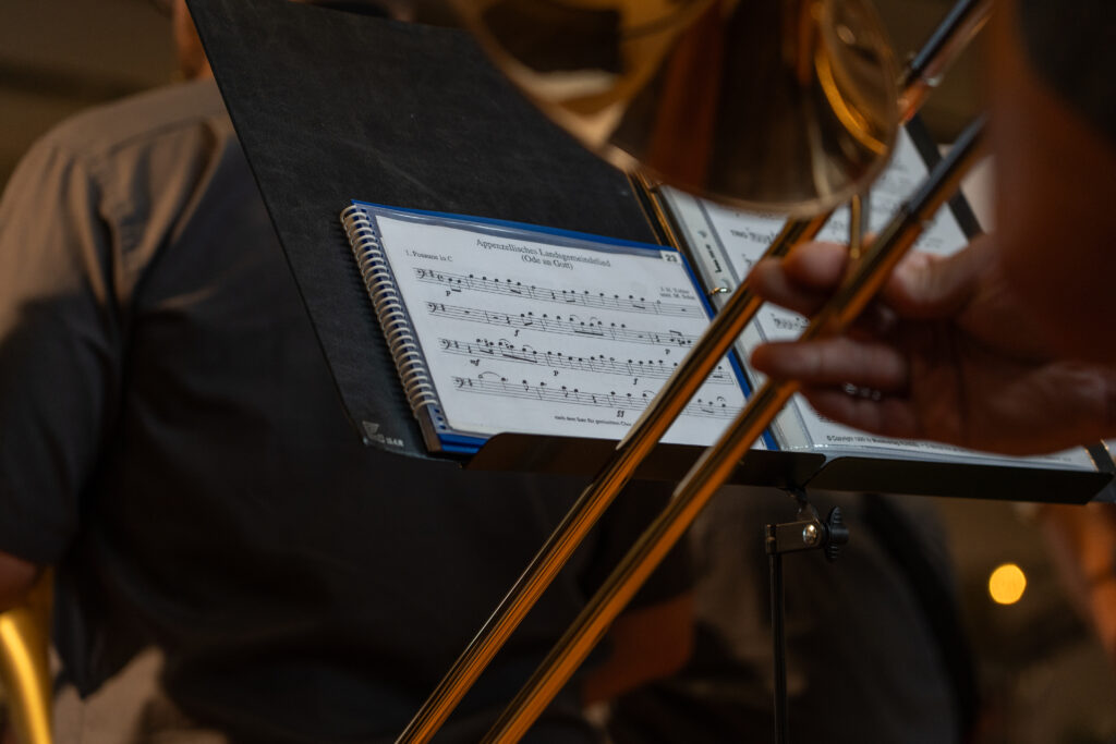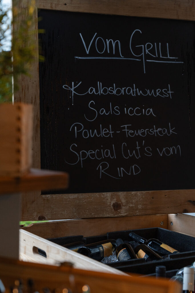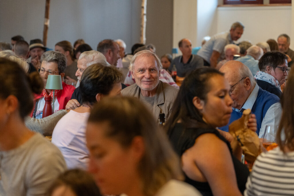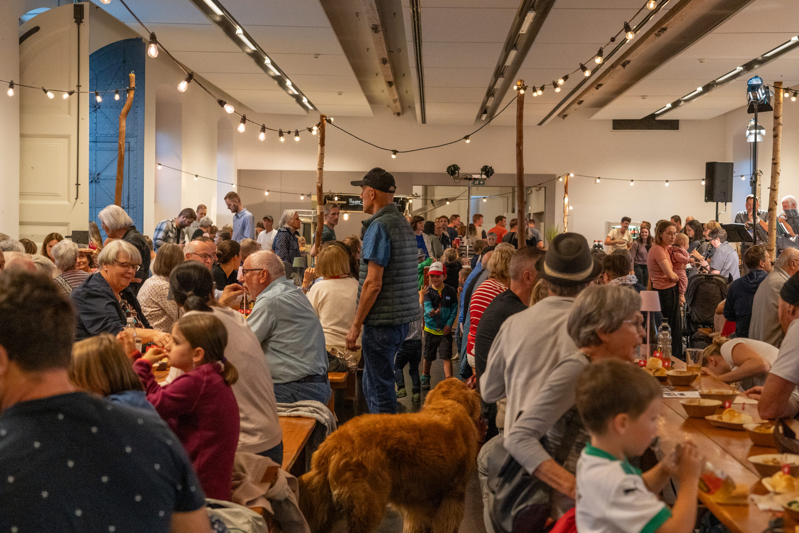 Als die Feier um 18 Uhr beginnt, hat sich der Himmel bereits verdunkelt. Kurze Zeit später fallen dicke Tropfen vom Himmel, ein Sommergewitter. Im Zeughaus verbreiten viele Glühbirnen und Lämpchen festliche Stimmung. «festlaune by foccaceria» sorgt auch dieses Jahr wieder für den kulinarischen Teil und ein stimmiges Ambiente. An den Tischen haben sich bereits einige Besucher und Besucherinnen versammelt. Schon werden die ersten Teller mit dampfendem Fleisch und Risotto reingebracht. Bald stimmt die Harmoniemusik ihr erstes Stück an. Gemeinderat Samuel Fischer lobt in einer kurzen Ansprache die lebendige Gemeinde, danach wird die Nationalhymne gespielt. Begleitet von der Harmoniemusik singen die Anwesenden die erste Strophe der Hymne, darauf folgt das Landsgemeindelied. Später wird das traditionelle Feuer entzündet. Dieses Jahr ist es allerdings kein klassisches Höhenfeuer. Denn die mächtigen Holzscheiter sind direkt vor dem Zeughaus aufeinandergestapelt. So soll das gemütliche Fest noch etwas kompakter werden.