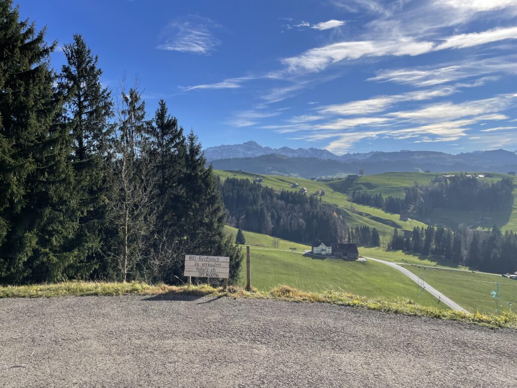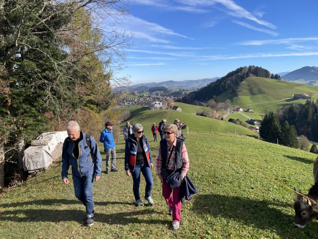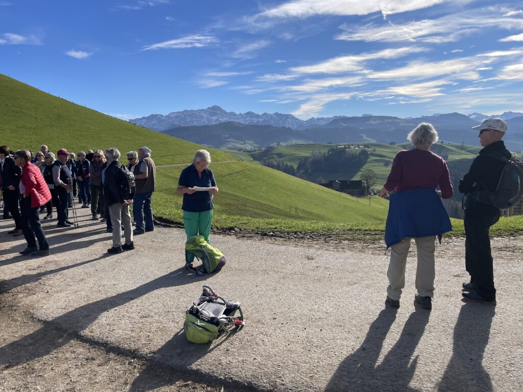 Der volle Bus fährt hinauf nach Schwellbrunn Dorf. Dort hätte heute Morgen die lange Wanderung starten und hinauf zur Risi führen sollen. Heute kommen alle 40 Teilnehmende in den Genuss der Busfahrt bis nach Schwellbrunn Risi. Von hier startet nun «ganz planmässig» die Wanderung «kurz». Diesen Streckenabschnitt wandern alle gemeinsam bis zum Restaurant Fuchsacker.