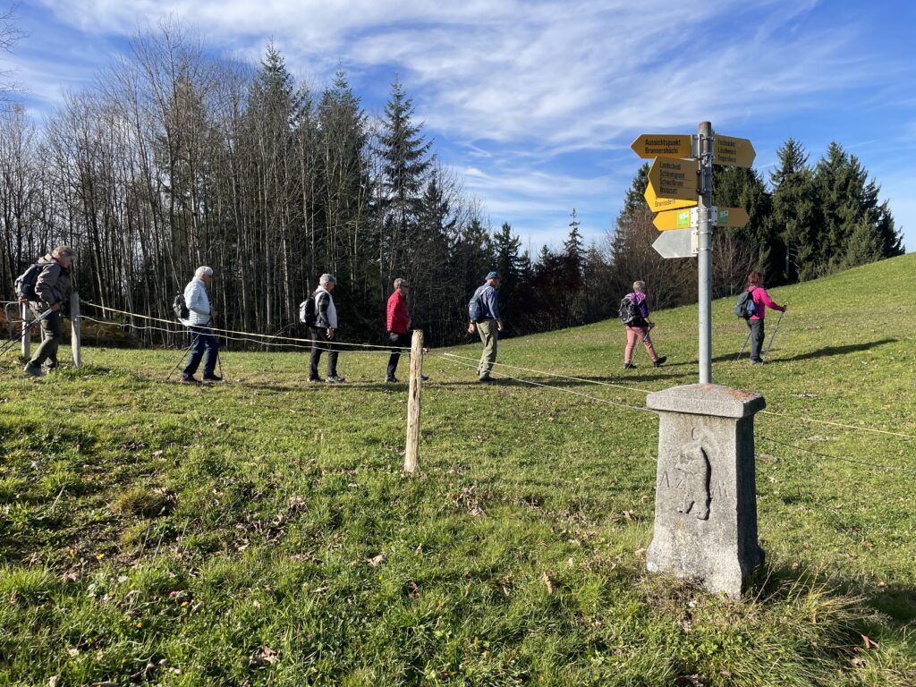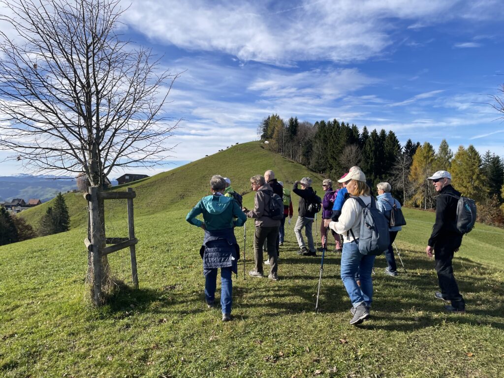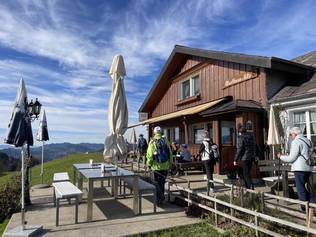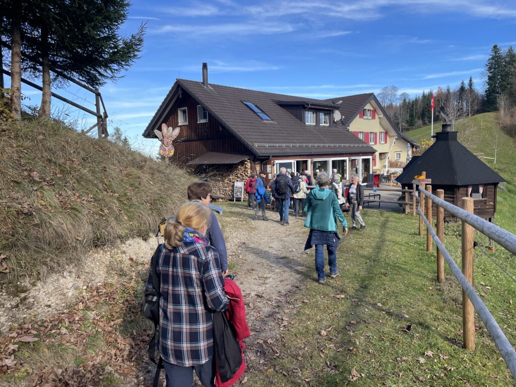 Es ist frühlingshaft warm. Immer mehr Jacken werden ausgezogen. Auch die vielen Gespräche der einzelnen Grüppchen scheinen angeregt zu sein. Nach einer Trinkpause führt der Wiesenweg zuerst talwärts und dann hinauf zur Fuchshöchi. Am Wegrand beäugt uns eine weitere, bunte Ziegenherde. «Was wollen die wohl alle hier?», scheinen sie sich zu fragen. Bald überqueren wir die Kantonsgrenze zwischen Appenzell Ausserrhoden und St. Gallen. Über den laubbedeckten Waldweg erreicht die Gruppe nach gut zwei Stunden das altehrwürdige Berggasthaus Fuchsacker um 12.30 Uhr. Chäshörnli mit gerösteten Zwiebeln, Siedwurst oder Apfelmus (vegetarisch) stehen auf dem Speiseplan.