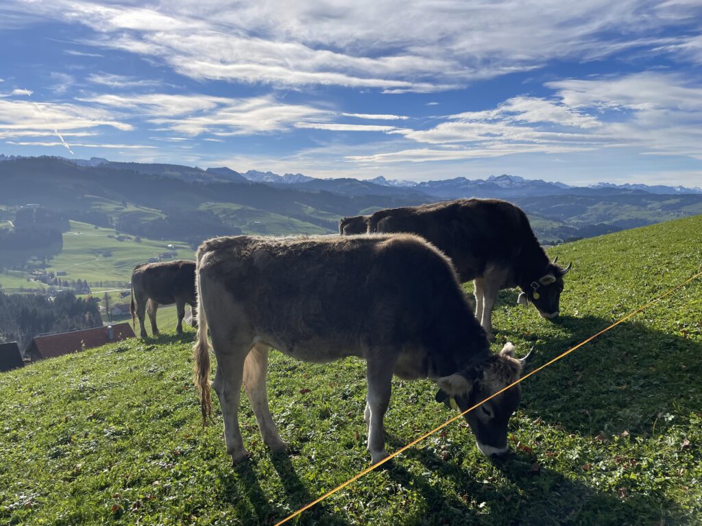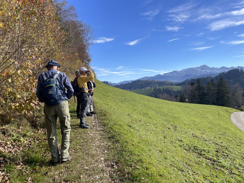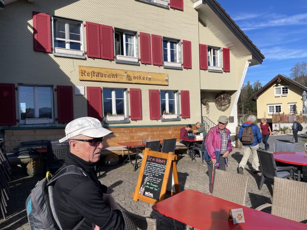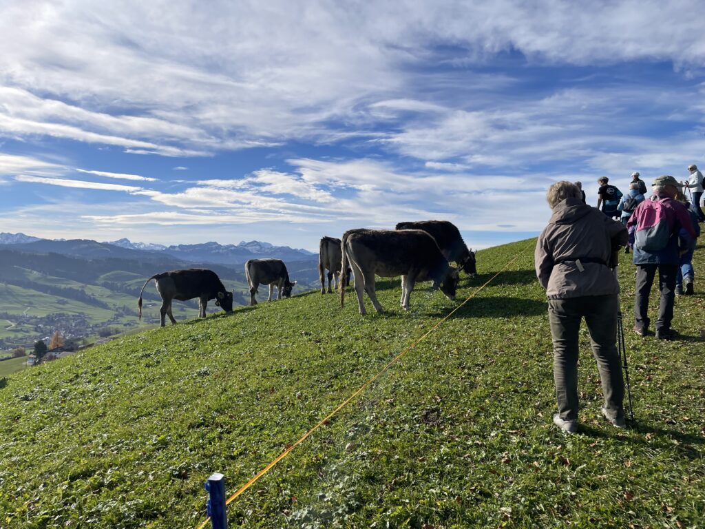 Es ist frühlingshaft warm. Immer mehr Jacken werden ausgezogen. Auch die vielen Gespräche der einzelnen Grüppchen scheinen angeregt zu sein. Nach einer Trinkpause führt der Wiesenweg zuerst talwärts und dann hinauf zur Fuchshöchi. Am Wegrand beäugt uns eine weitere, bunte Ziegenherde. «Was wollen die wohl alle hier?», scheinen sie sich zu fragen. Bald überqueren wir die Kantonsgrenze zwischen Appenzell Ausserrhoden und St. Gallen. Über den laubbedeckten Waldweg erreicht die Gruppe nach gut zwei Stunden das altehrwürdige Berggasthaus Fuchsacker um 12.30 Uhr. Chäshörnli mit gerösteten Zwiebeln, Siedwurst oder Apfelmus (vegetarisch) stehen auf dem Speiseplan.