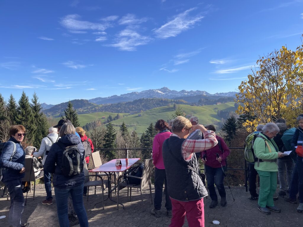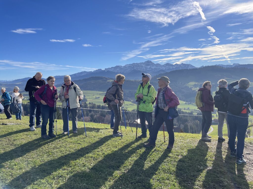 Pünktlich um 10.08 Uhr sitzen in Herisau alle im Bus. Dazugestossen sind mittlerweile auch diejenigen, die sich für die kürzere Wanderstecke angemeldet hatten und eine Stunde später losgefahren sind. Die Überraschung bereits in Herisau auf ihre Gspänli zu stossen ist gross, die Wiedersehensfreude noch grösser.