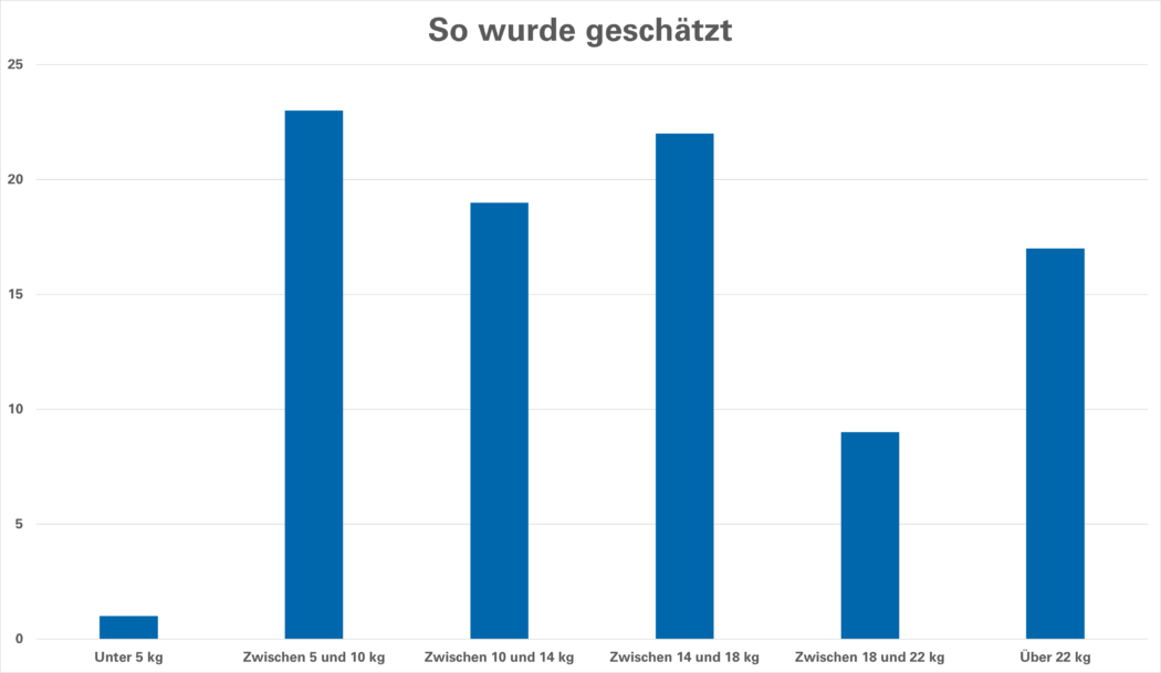 Übrigens: Auch Alessandro D’Aloia (15.6 kg), Luzia Keller (16 kg) und Joseph Zahner (16 kg) kamen dem gesuchten Gewicht sehr nahe. Wie sonst noch geschätzt wurde, sehen Sie in der untenstehenden Grafik.