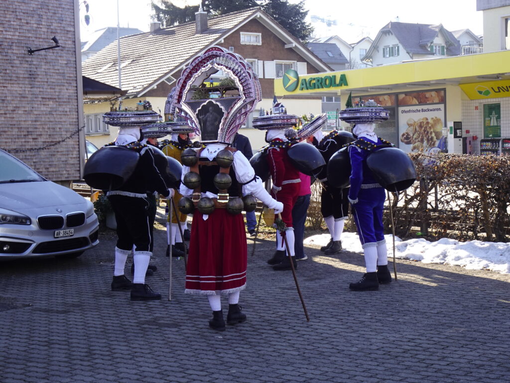 Heute verläuft ihr «Strech» ganz namenstreu durch und um das Wohngebiet Schönenbüel. Nach dem Anlegen von Groscht, Larven, Hauben und Schellen in der Garage – sie sind heuer «schö-wüescht» unterwegs – nehmen sie schon bald ihr erstes Zäuerli vor dem Haus. Inzwischen ist es kurz nach 5 Uhr und es haben sich schon einige Zuschauerinnen und Zuschauer eingefunden. Nach einigen Zäuerli, einigen Schlucken Weisswein und viel Schellengeläut nimmt der Schönenbüel-Schuppel seinen «Strech» in Angriff. Aber natürlich nicht, ohne den Anwesenden zum Abschied die Hand geschüttelt und «E guets Neus» gewünscht zu haben.